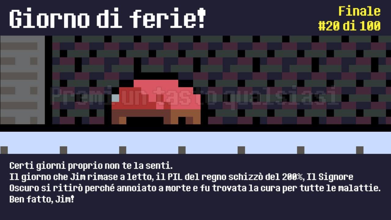 Sì perché queste ultime, assieme alla scrittura degli eventi, rappresentano il vero punto di forza del titolo. Pixelotto ce la mette tutta dal punto di vista creativo e consegna al giocatore un mondo pieno di robe assurde, con situazioni al limite e tante scemenze cche faranno onestamente sogghignare i giocatori. Molto divertente anche l’idea di cambiare continuamente il modello del giocatore con una lunga lista di personaggi giocabili, quasi uguali pe caratteristiche ludiche ma che sono collegati al finale ottenuto in precedenza.