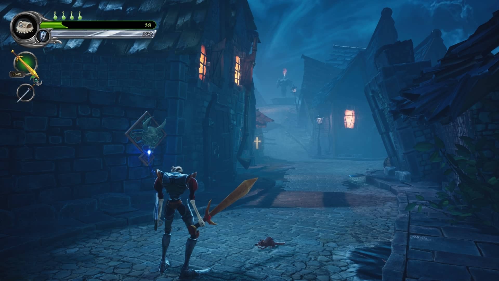 Per chi non fosse familiare con la saga, MediEvil è un’avventura dinamica dark fantasy, con delle sfumature di hack n slash. Il nostro scopo, come detto in precedenza, sarà quello di sconfiggere il malvagio Zarok e, nel frattempo, donare nuovo riposo ai morti di Gallowmere. Ci troveremo a dover superare diversi livelli, pieni di nemici da sconfiggere e tesori nascosti da trovare. Sono stati mantenuti i Calici delle Anime (qui potete trovare la nostra guida), da riempire al 100% per poter sbloccare nuove armi più potenti. Se ve lo state chiedendo, sì: la prima cosa che ho fatto una volta preso il controllo di Sir Dan è stato staccargli un braccio per ottenere un’arma di fortuna.