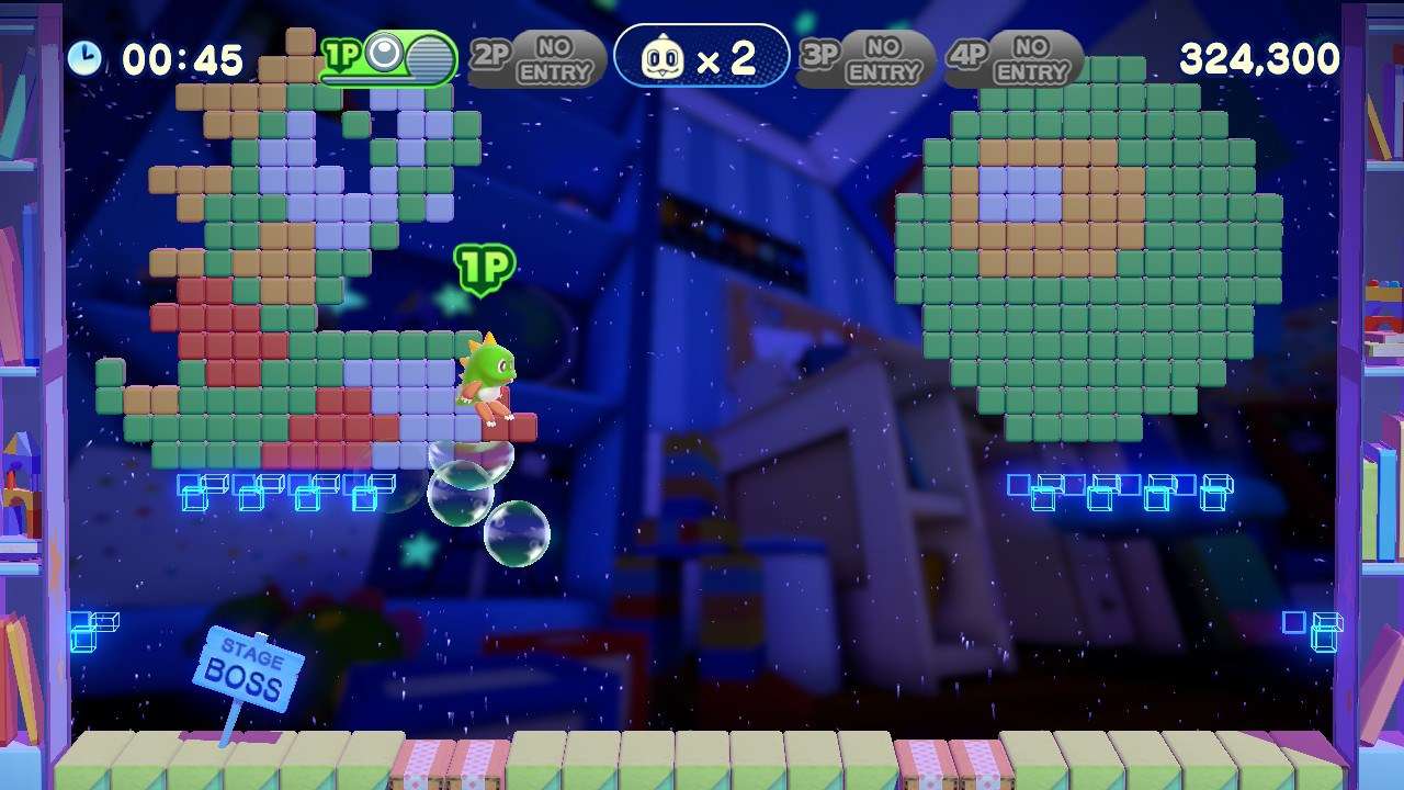Il titolo ha dalla sua cinquanta livelli nuovi di zecca, figli di un level design diverso da quello della serie originale, che porta il nostro draghetto verde in giro per la stanza del bambino, in ambientazioni sipirate ai giochi di quest’ultimo. Ogni livello è una schermata fissa che chiede al giocatore di eliminare gli avversari catturandoli all’interno delle solite bolle, in modo da farli poi scoppiare passandoci sopra. Le bolle seguono i flussi della corrente aerea (stavolta evidenziata a schermo) e possono essere usate per saltare e raggiungere posizioni altrimenti sopraelevate. Tra una bolla e l’altra il nostro draghetto potrà raccogliere frutta e lettere bonus, in modo da accumulare punti e arrivare all’ultimo stage dove dovrà fronteggiare un boss specifico per serie di livelli.