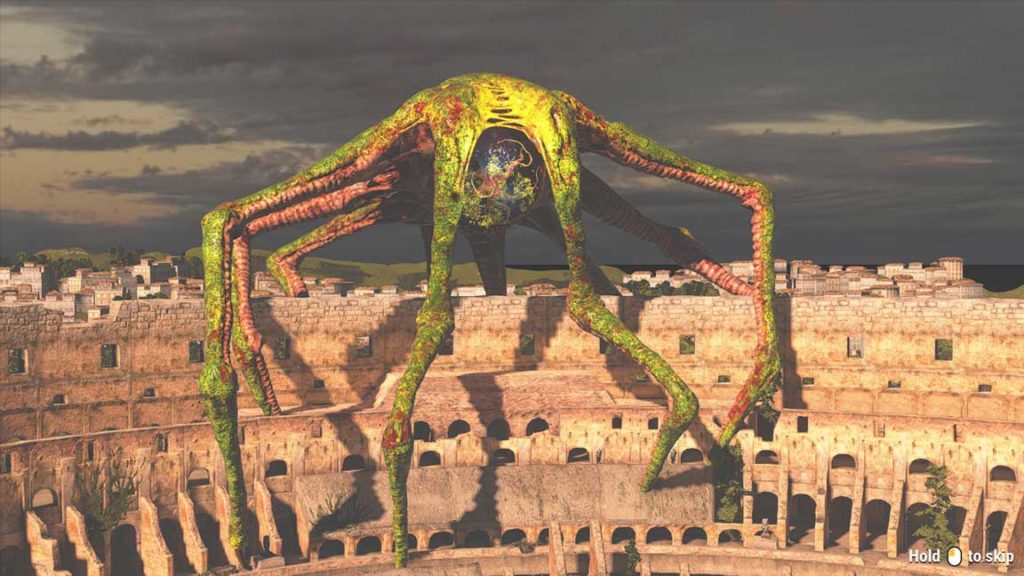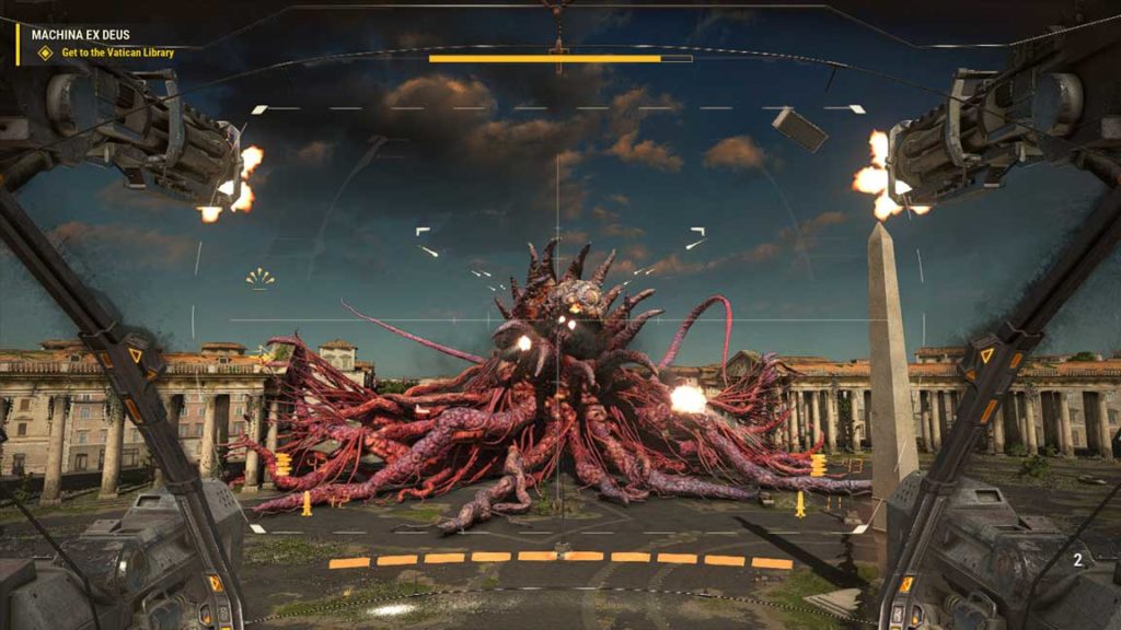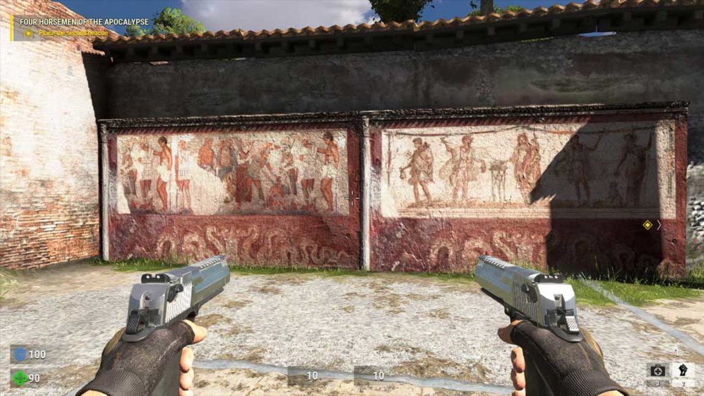 Lasciato il faraonico Egitto nel passato, o meglio, nel futuro, questo capitolo ci racconta di come è iniziata la battaglia a difesa della terra, e lo fa concentrandosi principalmente sull’Europa: da principio in Italia, con due magnifiche ricostruzioni stilisticamente (ma non geograficamente) accurate di Roma e Pompei, e poi in Francia, nella cittadella medioevale di Carcassonne. A differenza dei precedenti capitoli, questa volta non saremo soli: saremo accompagnati da un numero variabile di companion, ognuno con la sua arma di fiducia ed il suo humour. Come prevedibile infatti, ogni singolo passaggio del gioco è commentato in maniera ironica dal buon Sam, il quale arriverà persino a dare lezioni di one-liner ai suoi colleghi. Tutto questo umorismo, che in passato era quasi stucchevole, viene stavolta inserito in un contesto narrativo più profondo, che vi farà ridere a crepapelle ma che sarà anche capace di emozionare. Questo è un enorme balzo in avanti per la saga, che finalmente aggiunge ad un contesto di gameplay in cui la narrativa era accennata a malapena, ad un gioco con una vera trama, con dei personaggi ricorrenti e un insieme di NPC e messaggi che va a popolare il mondo intorno al gioco.
