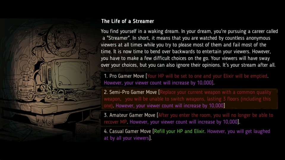 Di morte in morte il giocatore acquisirà la possibilità di droppare oggetti di determinata qualità, aumentando alcune sue caratteristiche pagando in una valuta specifica. Più si andrà avanti nel gioco più elisir curativi sarà possibile portarsi dietro, più soldi si tratterranno alla morte e così via.