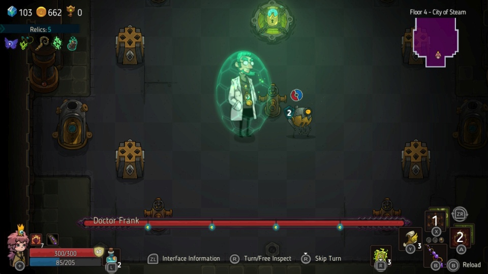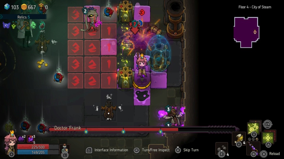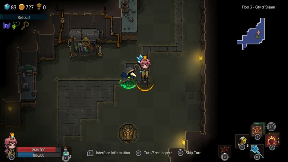 Volendo provare a descrivere in termini puramente analitici il titolo potremmo mettere in piedi la seguente definizione: top down roguelike con elementi ruolistici in un contesto da dungeon crawler. Il giocatore, nei panni della protagonista, si muoverà all’interno di dungeon generati casualmente muovendosi di casella in casella, attaccando, utilizzando abilità, raccogliendo armi e risorse. Il giocatore avrà la possibilità di sfruttare abilità legate a dei famigli che andranno sconfitti in battaglia all’ultimo sangue di piano in piano, ognuno con il suo set di elementi e di peculiarità.