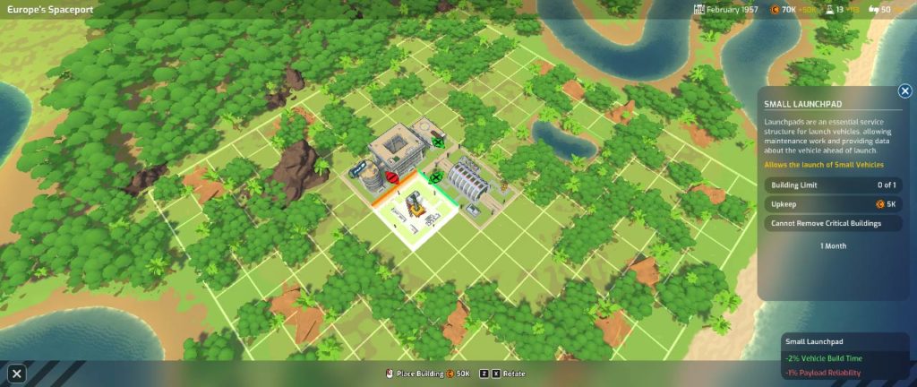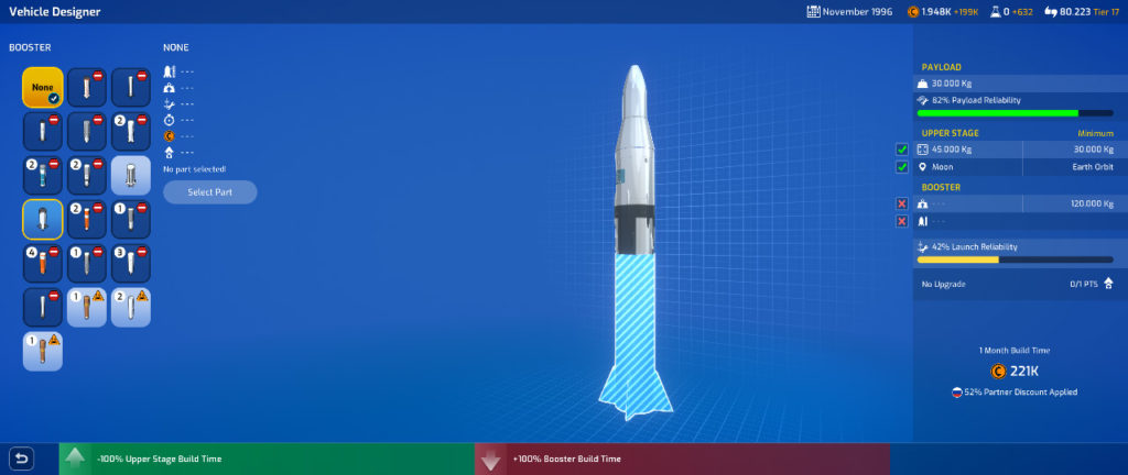 Quando il payload è pronto, si passa alla costruzione del razzo per altri mesi. Alla componente appena assemblata vanno quindi aggiunti uno stadio superiore e un propulsore, ed eventualmente altre variabili che vengono sbloccate durante il gioco. Ogni pezzo che va a comporre il razzo conferisce diverse caratteristiche alla riuscita della missione, tutte perfettamente spiegate da un dettagliato tutorial che può accompagnare il giocatore in ogni partita fin dal suo principio. La costruzione dei razzi non è dettagliata come in altri giochi come Kerbal Space Program, ma è giocosa e piena di parametrini da tenere sott’occhio senza difficoltà.