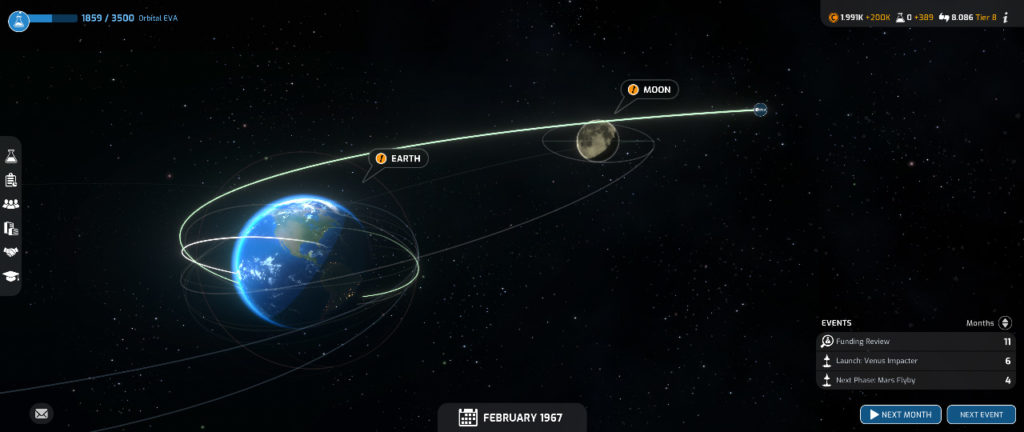 La schermata principale si apre su una mappa astronomica laterale che rappresenta i corpi celesti raggiungibili. Inizialmente avremo missioni a disposizione solo per il Pianeta Terra, ma ben presto, col raggiungimento di determinate milestone, la prospettiva si allarga man mano portandoci a contatto con la Luna, coi pianeti interni e con i corpi celesti più lontani.