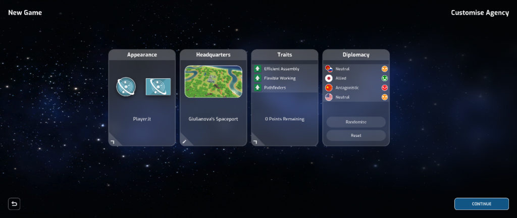 A ciò poi va aggiunto il gameplay del giocatore e la sua personalizzazione. Io ad esempio ho creato l’agenzia spaziale Player.it con le seguenti caratteristiche: