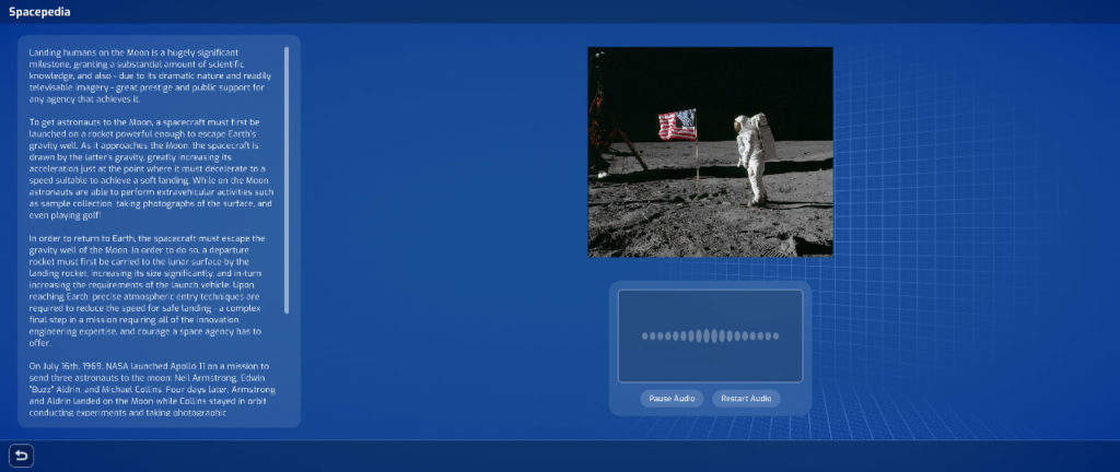 A proposito dell’accuratezza storica, come non citare l’imponente Spacepedia, un’enciclopedia enorme che contiene al suo interno i resoconti storici delle missioni, la spiegazione del funzionamento di booster e razzi che il giocatore sblocca, foto e perfino audio degli eventi della storia spaziale.