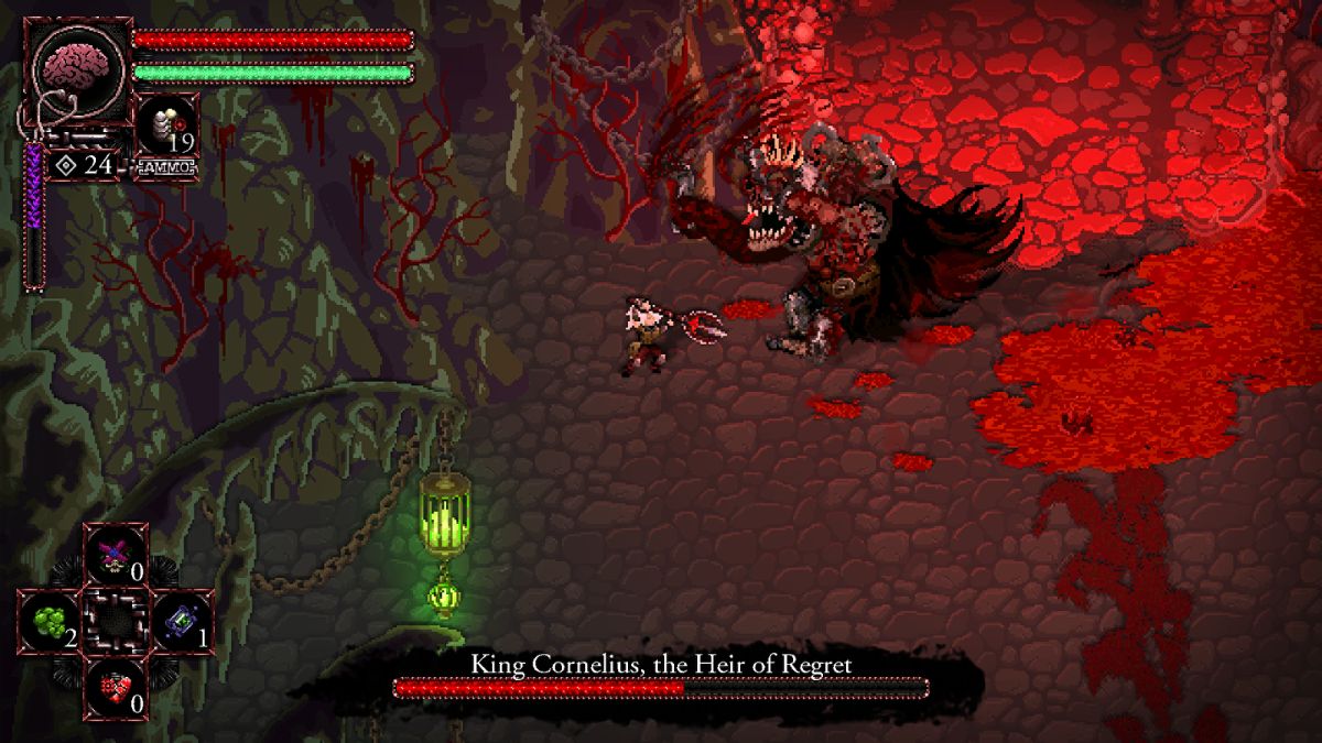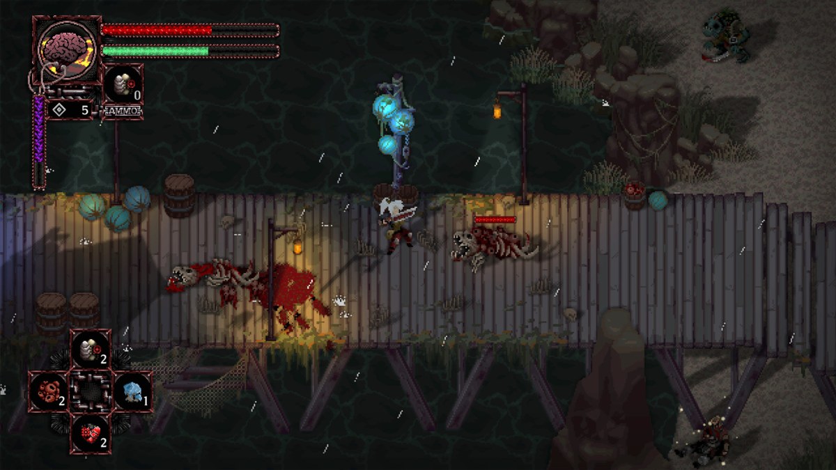 La pixel art di Morbid: The Seven Acolytes è ben fatta e crea la giusta atmosfera di orrore e disperazione. La presenza di carne putrida e bulbi marcescenti da cui spuntano parassiti ostili ovunque dà proprio l’idea di una terra malata e corrotta da un male non di questo mondo.