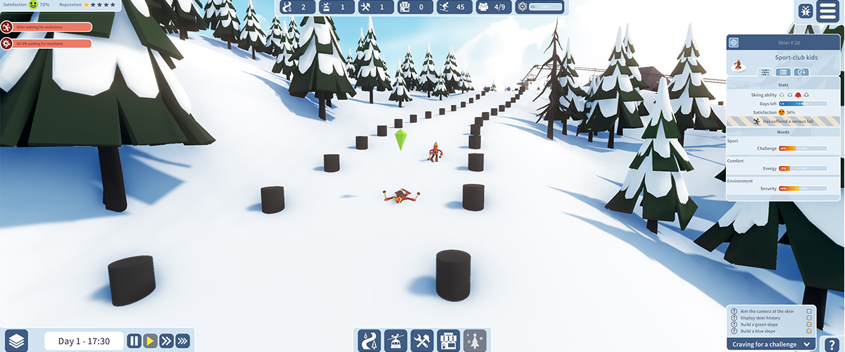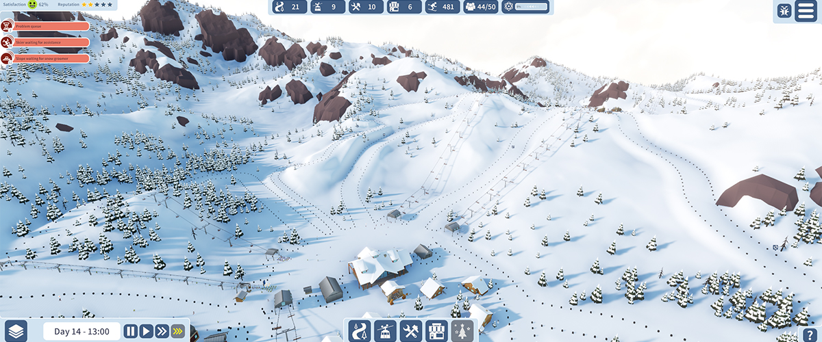 L’unico parametro che conta in Snowtopia è il grado di soddisfazione degli sciatori, in grado di influenzare quanto spesso arrivino nuovi volontari all’interno del proprio territorio, da utilizzare come staff per far funzionare le diverse strutture che il giocatore costruisce.