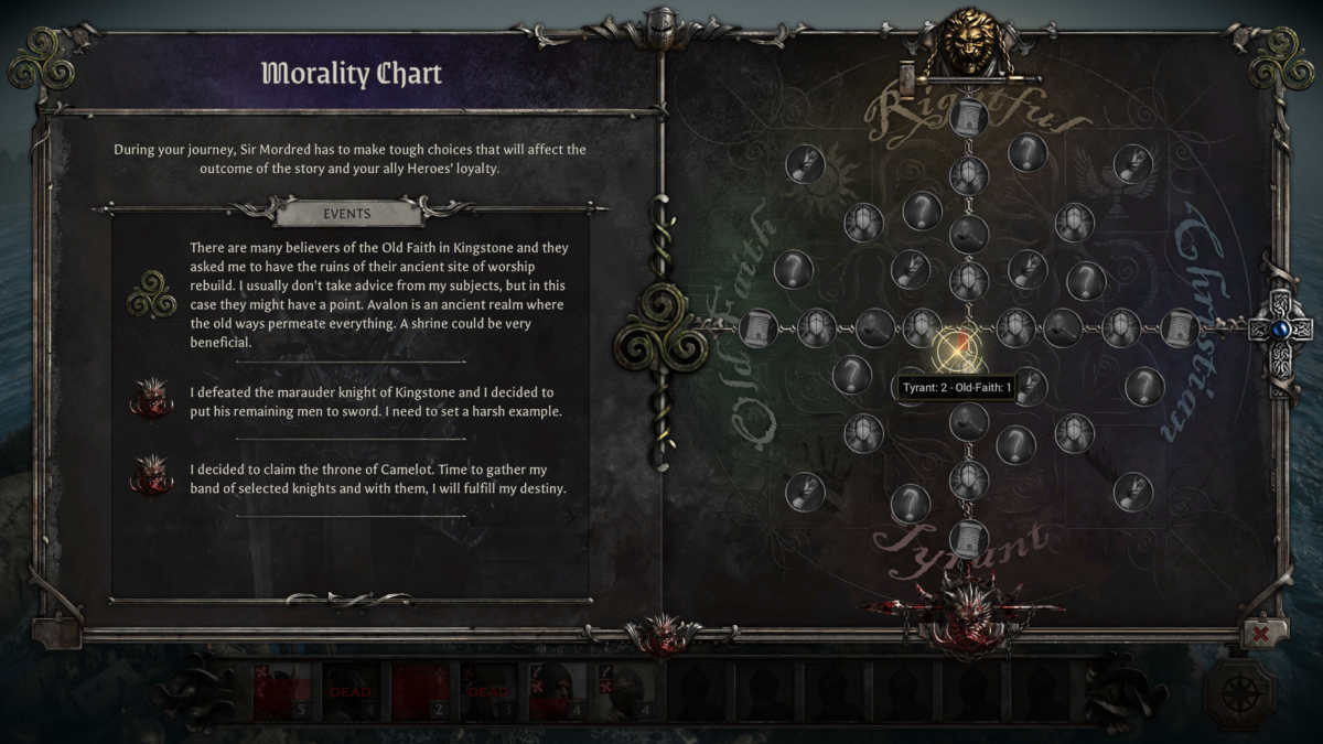 Per nobili che siano le intenzioni della Dama, questa non ha fatto i conti con la personalità di Sir Mordred, che il giocatore è chiamato ad interpretare. Sarà infatti possibile compiere determinate scelte in momenti chiave della narrazione, le quali andranno ad influenzare alcuni sviluppi successivi: tali scelte – riguardanti ad esempio eventi di missione o decisioni gestionali da prendere tra una missione e l’altra – concorrono a costituire un sistema di moralità che ci vedrà oscillare entro quattro quadranti, derivanti dalla combinazione di due categorie di coppie contrapposte: pagano/cristiano e giusto/tiranno. Sostanzialmente si potrà modellare il proprio allineamento in uno spettro che va da “legale buono” a “legale malvagio” per usare concetti tipici dei GDR.