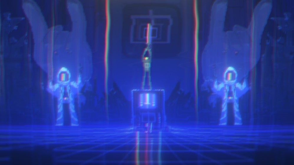 Tra tecnospade (che vedremo nel dettaglio fra poco), raggi tricromi e floppy disk da usare come tavola da surf l’alchimia di Narita Boy è potente e terribilmente evocativa. Ci ha ricordato, per certi versi, l’intelligenza con cui l’immaginario cristiano è stato declinato per la creazione di un metroidvania soulslike all’interno del sempre spagnoleggiante Blasphemous.