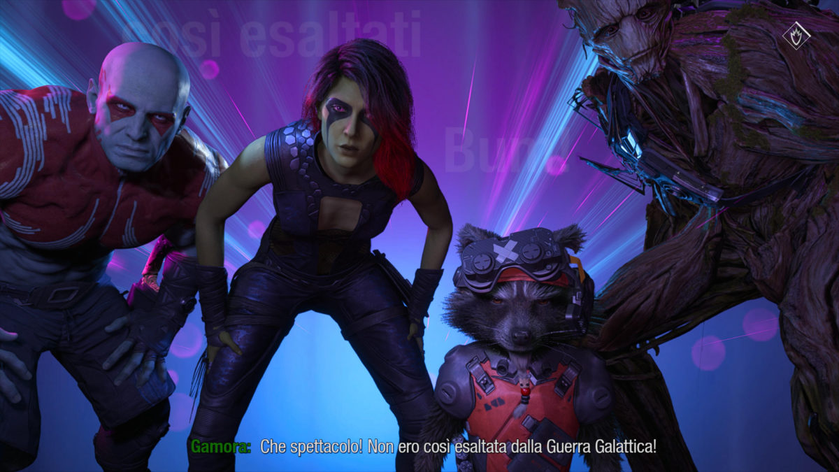 Quando la barra di Adunata è completamente carica, con la pressione di entrambi i dorsali Star Lord può richiamare a sè l’attenzione dei compagni in un Huddle di stampo molto rugbystico; in questo momento ognuno dei guardiani esporrà le sue sensazioni sulla battaglia in corso – eccitazione per il momento, gioia, disfattismo, ogni linea di dialogo varia da guardiano a guardiano e da huddle ad huddle – e sarà nostro compito scegliere tra due la giusta risposta per spronare la squadra a dare il meglio.