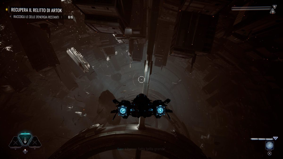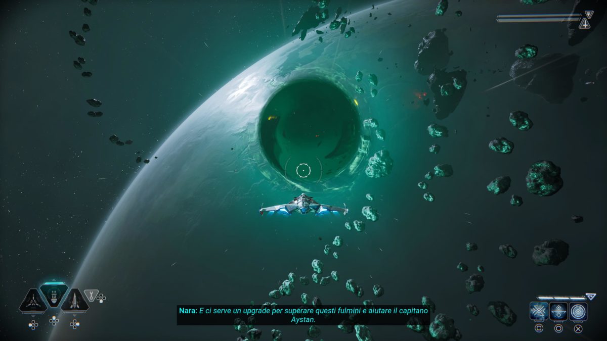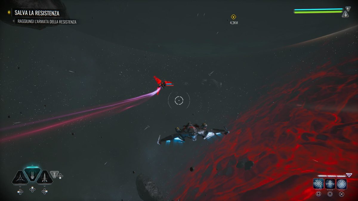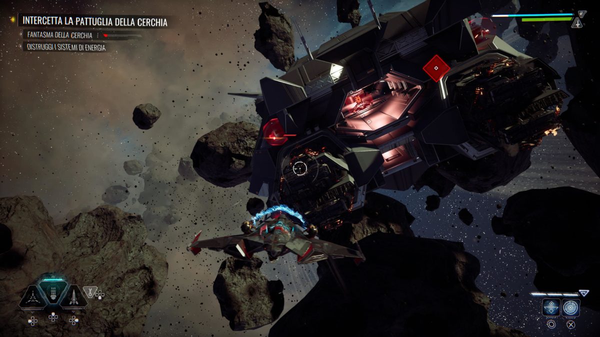Ma come sono i combattimenti in Chorus? Volendo usare una metafora: è come essere a bordo di una “fuoriserie volante” armata di tutto punto. Nonostante un pizzico di strategia sia comunque presente (prettamente incentrato sulle armi da utilizzare e sugli scudi nemici da abbattere), gli scontri con altre navicelle sono un’esperienza prettamente arcade, sotto certi aspetti simile a quanto visto in Doom Eternal, dove siamo obbligati a rimanere sempre in movimento.