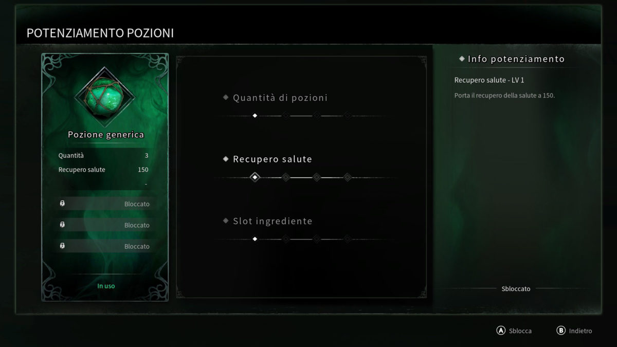 Le cure nello specifico vengono sotto forma di tre tipi di pozioni che possiamo equipaggiare (di cui spesso finiremo a utilizzare solo una) e che potremo potenziare non solo in termini numerici ma con degli ingredienti che troveremo nelle mappe di gioco che daranno ulteriori bonus, quali resistenza al danno, danni aumentati ecc.