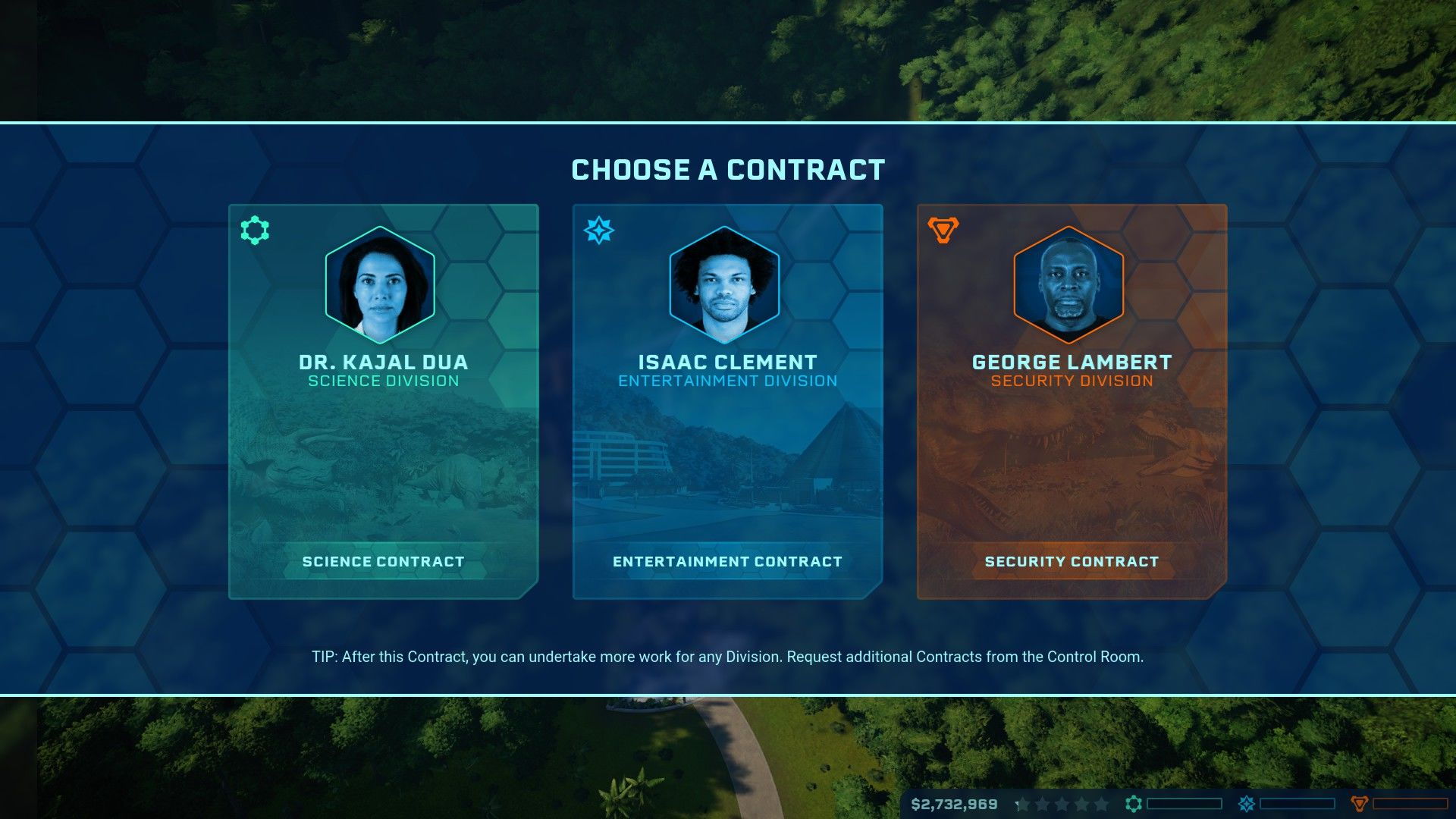 Oltre a Malcolm saranno presenti altri personaggi noti del film come Owen Grady (Chris Pratt) e Claire Dearing (Bryce Dallas Howard) ma i più importanti saranno i rappresentanti delle 3 divisioni del parco: Scientifica, Intrattenimento, Sicurezza. Ognuno di loro ci fornirà degli incarichi che variano dal fotografare dinosauri o cercare fossili fino ad arrivare a creare una determinata specie con un determinato corredo genetico. Completare un incarico ci permetterà di sviluppare un determinato aspetto del parco.