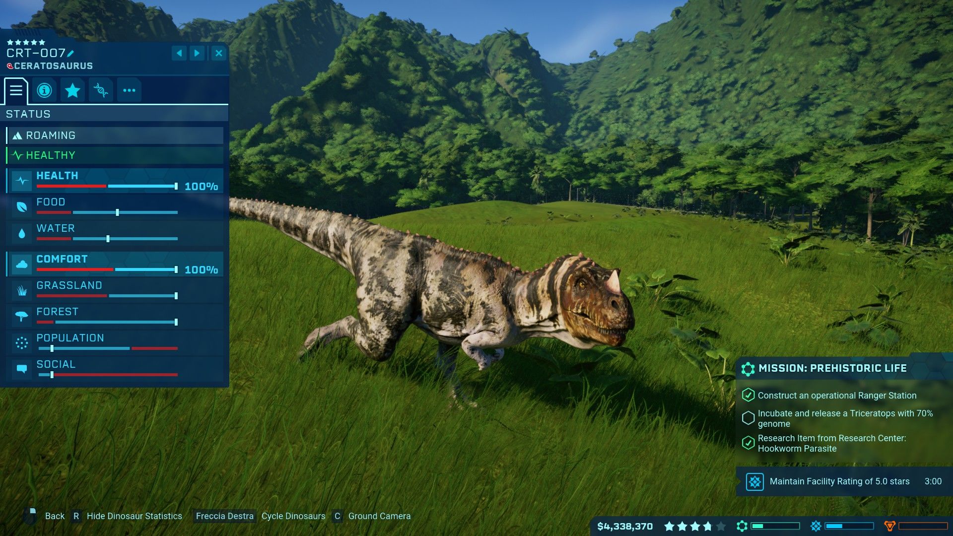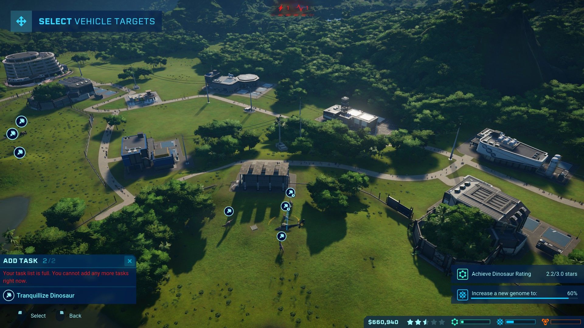 Per compensare a questa mancanza, oltre all’introduzione dell’ingegneria genetica, Frontier ha pensato bene di dare ai dinosauri una I.A. più elaborata, ognuno ha delle statistiche come ambiente, popolazione e gruppo sociale che se non rispettate porteranno alla ribellione dell’animale con conseguente fuga. Alcune specie imparano anche i punti deboli della struttura andando ad attaccare sempre lo stesso punto fin quando non capirete che è il momento di aggiornare quel pezzettino di recinzione che vi era sfuggito.