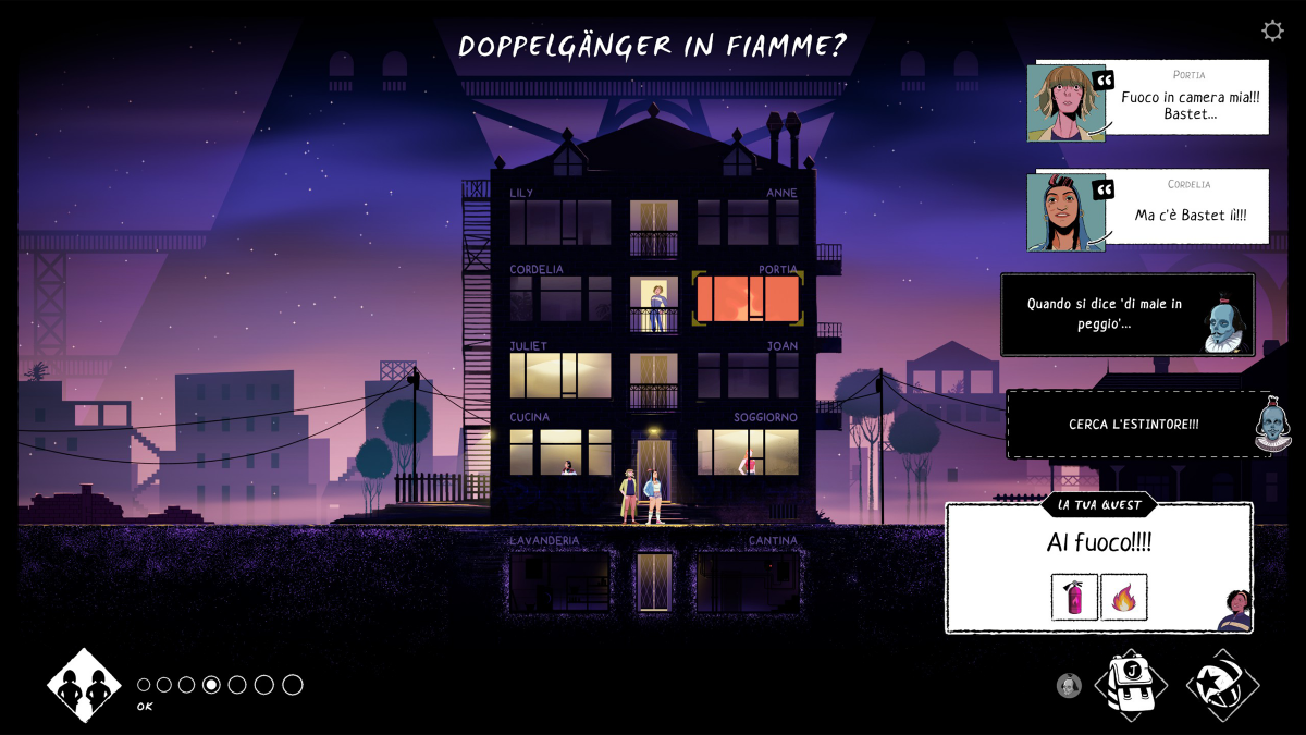 L’unica cosa relativa all’interfaccia che personalmente ho trovato poco chiara e tanto ingombrante, è il box a destra che indica le mansioni di turno. Il riquadro risulta molto grande, quasi un bottone da premere, e infatti nelle prime fasi di gioco ho perso qualche linea di dialogo perché mi veniva inconsciamente da cliccarci sopra, mandando avanti le conversazioni per sbaglio. Ma si tratta veramente di andare a cercare il pelo nell’uovo, dato che Roller Drama si contraddistingue nella sua qualità anche e soprattutto per la pulizia grafica.