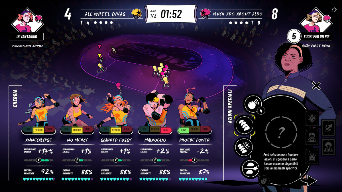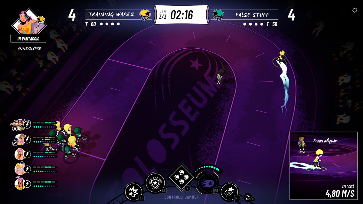 Il giocatore controlla le azioni della squadra e in particolare della Jammer, colei che ha il ruolo di percorrere tutta l’arena per doppiare le avversarie e segnare punti. I controlli, almeno su PC, sono inizialmente poco intuitivi ma essendo strutturati su un’unica riga della tastiera diventano presto di facile padronanza.