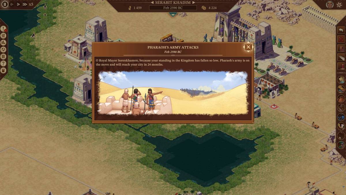Altri incidenti di percorso si notano qua e là, cose minori che non inficiano davvero il gioco ma che ogni tanto lo complicano. Per fare un esempio, nonostante una reputazione altissima col faraone, il suo esercito continuava ad attaccarmi per bassa reputazione.