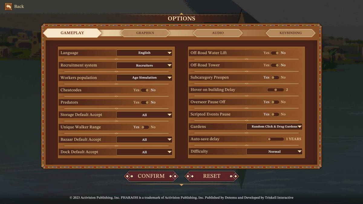 A livello di gameplay Pharaoh: A New Era non si discosta per nulla dall’originale, complice anche la sua natura di remake. Le meccaniche di gioco sono le stesse con l’unica eccezione del combattimento: se nella vecchia versione l’invasione di un esercito nemico veniva visualizzata direttamente nella mappa di gioco ed era un evento real time, ora gli scontri militari avvengono all’interno di una finestra di pop-up e sono gestiti dal computer.