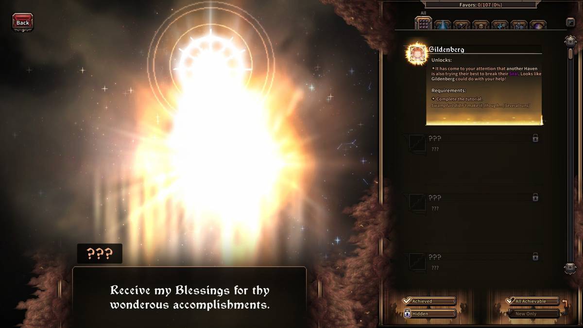 Quello viola accetta la nostra Tainted Essence, una risorsa che si farma dopo ogni notte che si è sopravvissuti, in cambio di nuovi elementi da sbloccare nel gameplay. Quello giallo invece funziona come un sistema di achievement (chiamati benedizioni), per il quale una volta soddisfatti determinati requisiti di gioco ci offre nuovi contenuti (perlopiù oggetti ed equipaggiamenti).