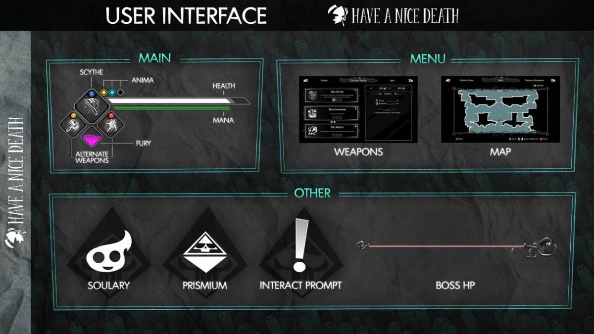 Have A Nice Death infatti, ha sfondi e personaggi interamente disegnati a mano. Tramite la tecnica di fini artisti digitali, si è arrivati alla creazione di personaggi dalle forme più strane e complesse, con delle idee di design che trovano forse la massima espressione nella rappresentazione delle Sofferenze.