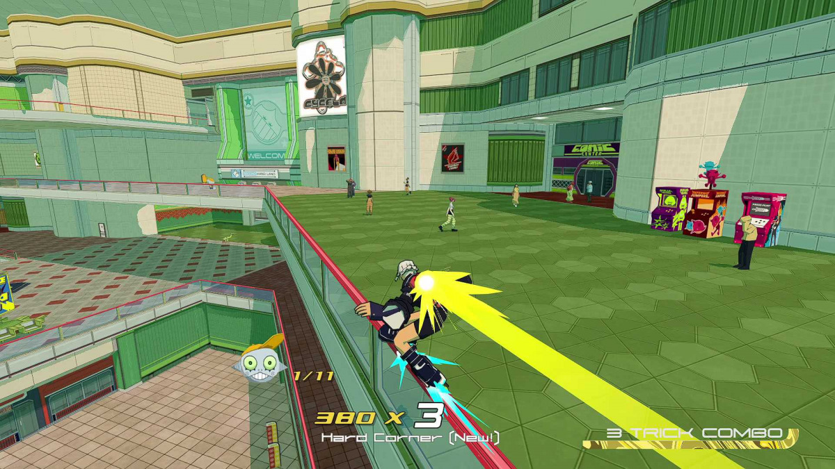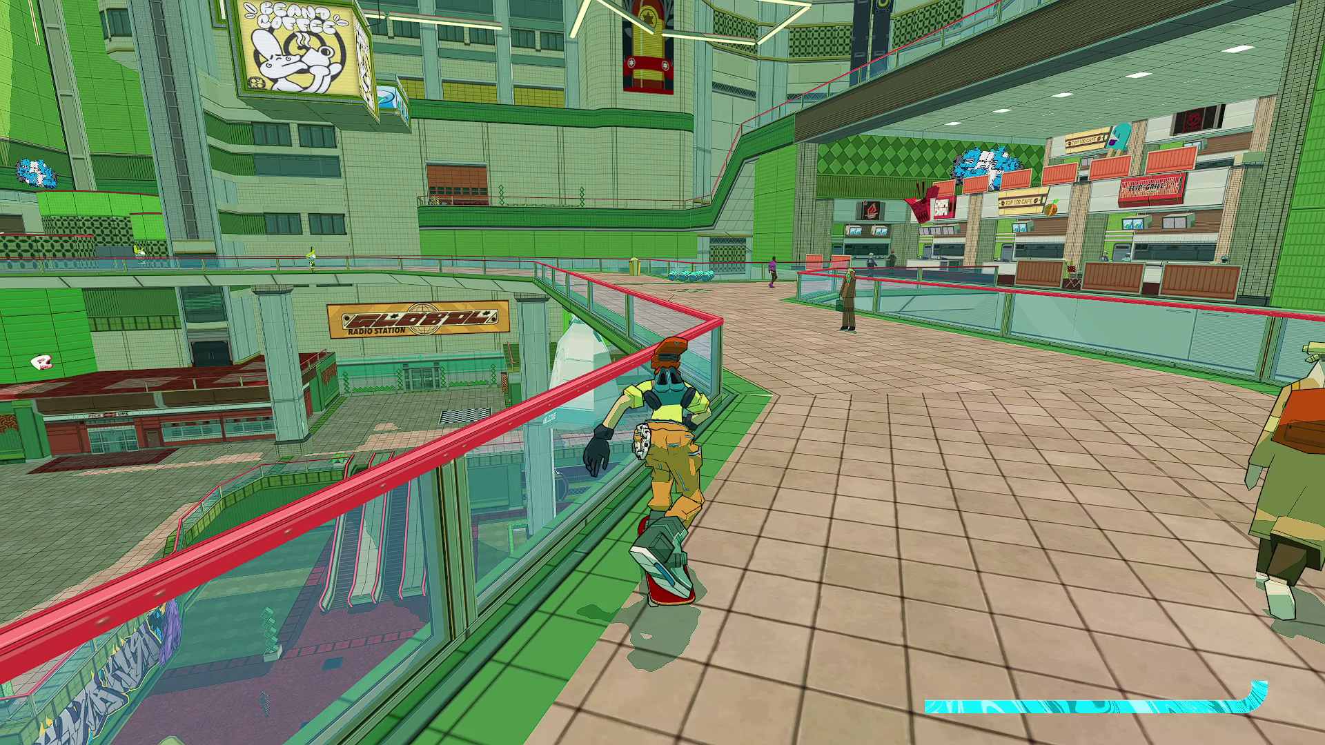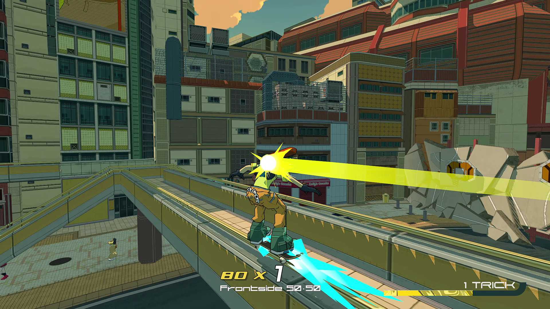 Bomb Rush Cyberfunk, nonostante la presenza di punteggi, è estremamente più improntato sull’offrire un’esperienza ideale di “andare in giro per la città a fare i graffiti mentre si vola sullo skateboard”.