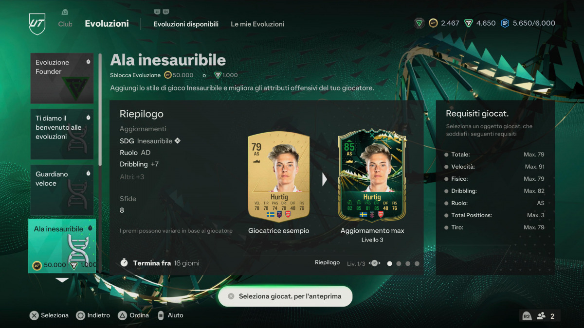 L’altra novità di Ultimate Team è rappresentata dalle evoluzioni che permettono al giocatore di dare il proprio tocco personale alle squadre; questo sistema rende possibile trasformare tutte le “carte giocatore” di bassa qualità e che soddisfano certi requisiti in dei veri e propri campioni grazie al raggiungimento di determinati obiettivi in campo.