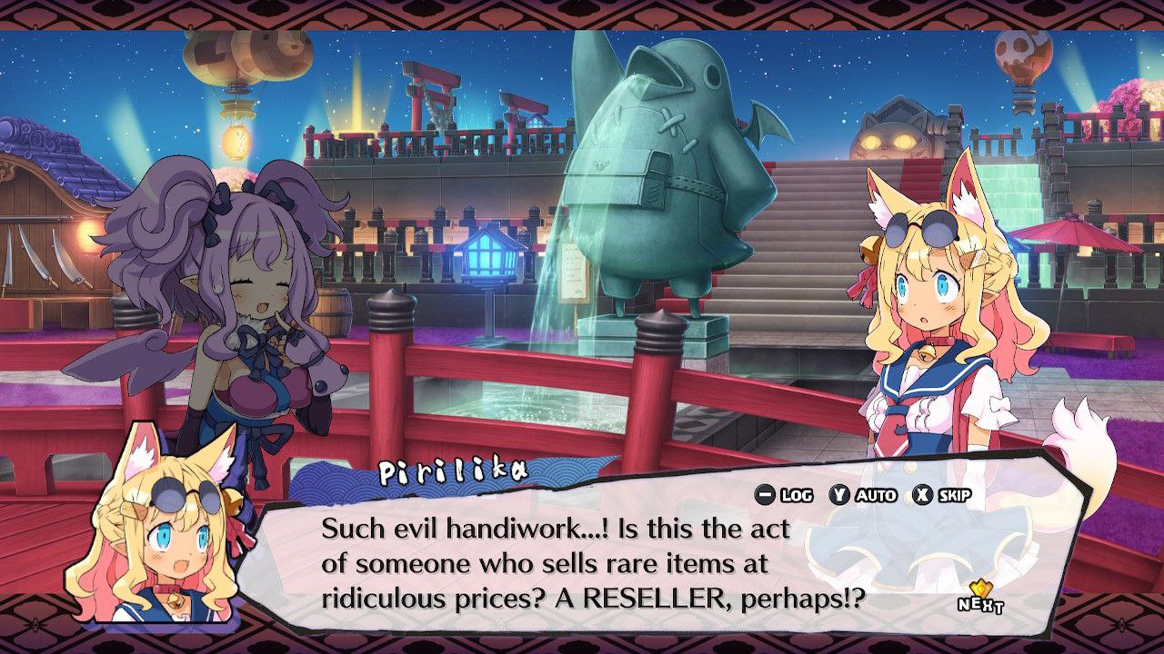 Per quanto è indubbio che questo genere di narrativa possa avere scarso piglio su chi mal sopporta le giapponesate, bisogna evidenziare quanto buon lavoro sia stato fatto da Nippon Ichi per aggiornare tanti topos a tematiche attuali. Il gioco fa continui riferimenti metatestuali al mondo reale, all’animazione giapponese, ai meme e a questa o quella follia. Da una parte troviamo l’angolo di oltremondo dedicato unicamente al reselling, con tanto di stilettata nei confronti di Sony per la malagestione del lancio di Playstation 5, dall’altra invece troviamo delle scenette conclusive di capitolo che fanno esplodere dal ridere per le immagini utilizz