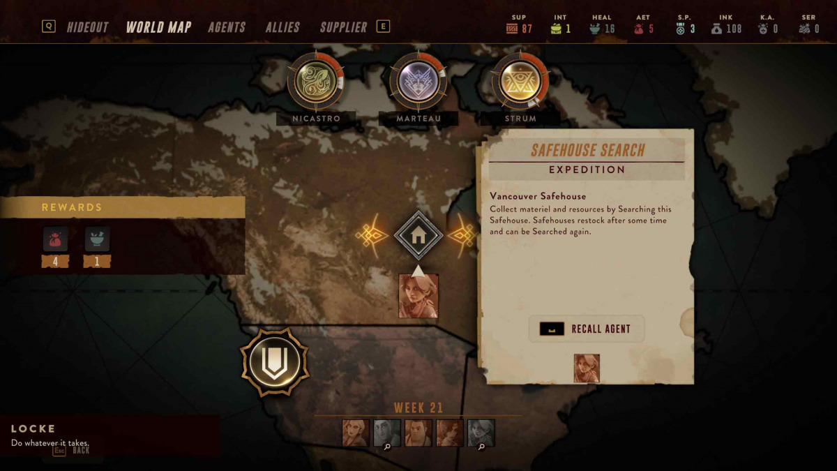 Durante la fase dell’hub vi è presente la mappa di gioco, la quale traccia anche il progresso dei tre antagonisti. Ogni turno sulla mappa ci saranno una serie di missioni possibili, alcune richiederanno di essere giocate e avranno un numero massimo di agenti che si potranno mandare in missione, altre invece saranno semplici indagini che occuperanno 1 agente per quel turno. Alcune di queste missioni saranno legate agli antagonisti e saboteranno il loro progresso, mentre altre portano avanti il progresso dei lampionai stessi.