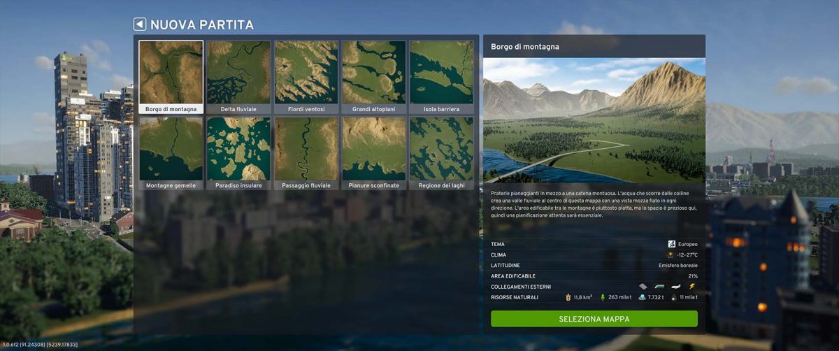 Per cominciare una partita a Cities: Skylines II è sufficiente scegliere una tra le 10 mappe disponibili, scegliere se impostare la guida a destra o sinistra, ed eventualmente selezionare il tema degli edifici, cambiabili comunque anche all’interno della partita stessa. Tra le impostazioni di lancio della mappa è possibile scegliere di giocare in modalità normale, con tutti gli edifici sbloccati o con soldi illimitati, oppure se attivare o disattivare i disastri come cicloni, incendi, tsunami e terremoti.