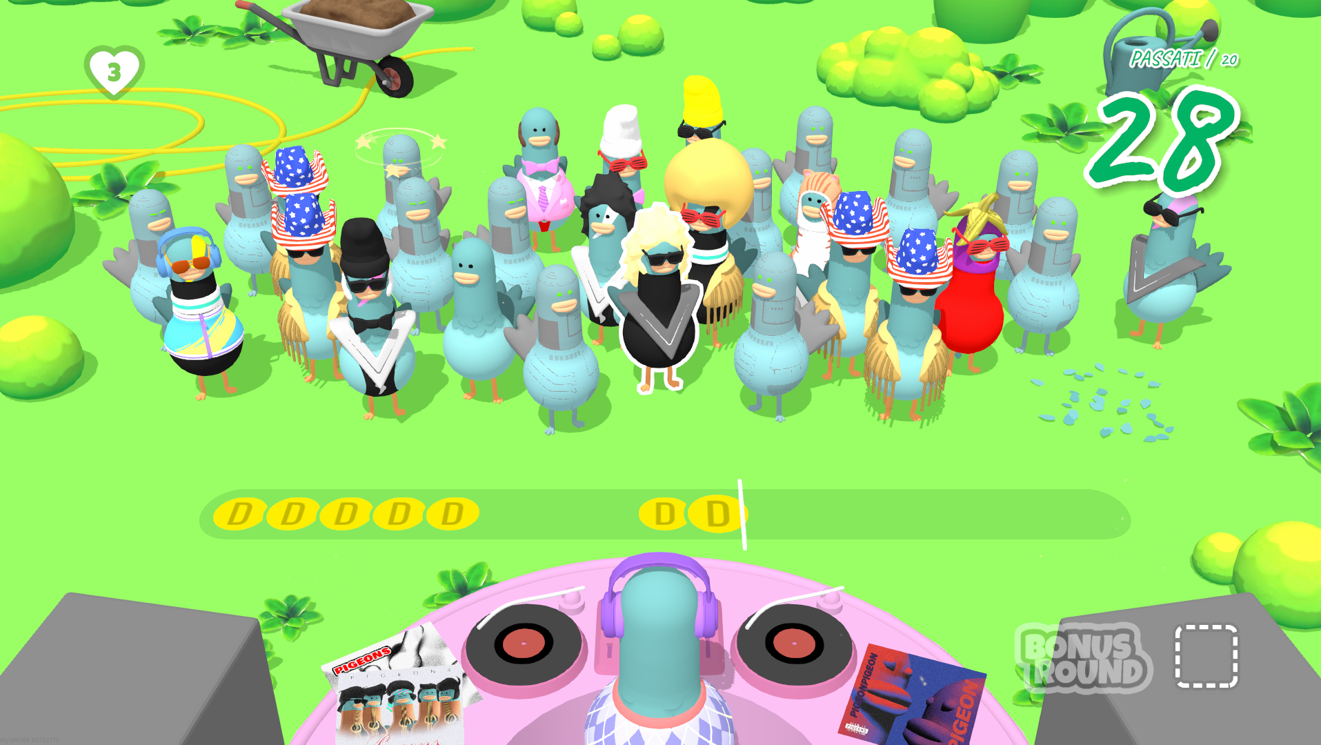 Ad arricchire ogni round ci pensano alcune interessanti variabili come gli oggetti, dei bonus (o malus per gli avversari) da acchiappare più velocemente degli altri senza lasciarsi distrarre dal minigioco musicale, e lo Stage Bonus, un indicatore che si riempie facendo roteare il collo del proprio piccione in momenti specifici del round. Quando lo Stage Bonus è pieno, si ottiene un bonus specifico per ogni minigioco: può essere una buona strategia decidere di caricare l’indicatore appieno durante il minigioco finale, così da ottenere un importante vantaggio e conquistare il primo posto un po’ più facilmente.