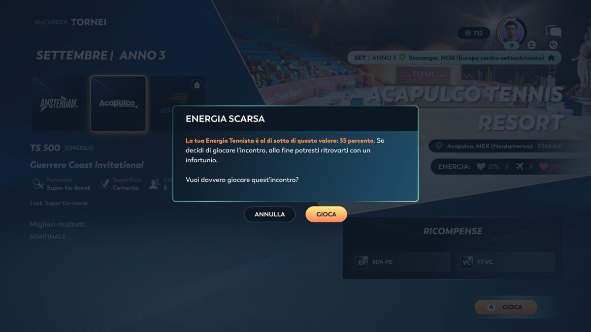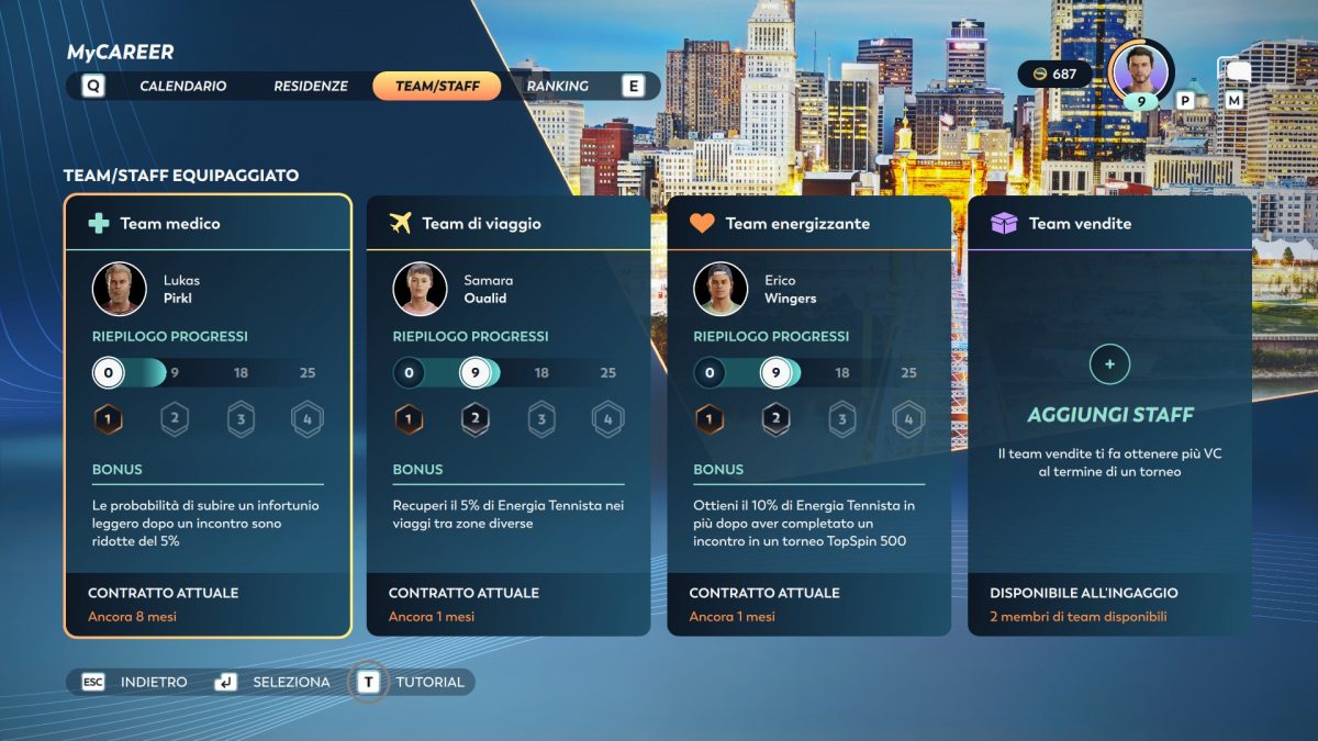 Durante la vostra scalata a numero 1 del mondo dovrete affrontare 3 tipologie di evento: allenamenti, sfide sponsor e tornei veri e propri. Avrete a disposizione un team completo di allenatori, preparatori, medici e tante cose da fare durante i periodi di riposo forzati tra un torneo e l’altro perché la cosa più frequente che vi capiterà di fare sarà… subire un infortunio!