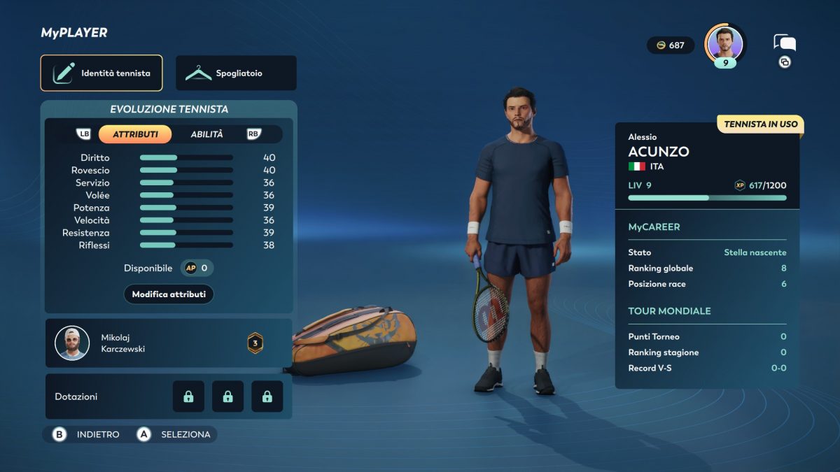 L’editor è abbastanza profondo: sono riuscito in poco tempo a creare un personaggio praticamente identico a me stesso, con gli stessi completini, racchetta e scarpe.