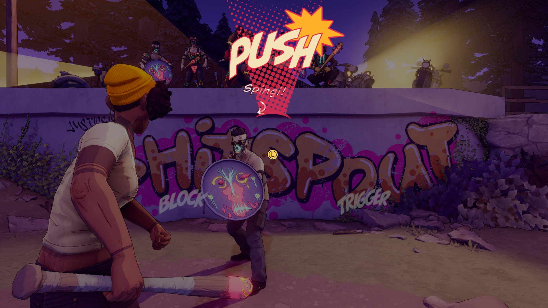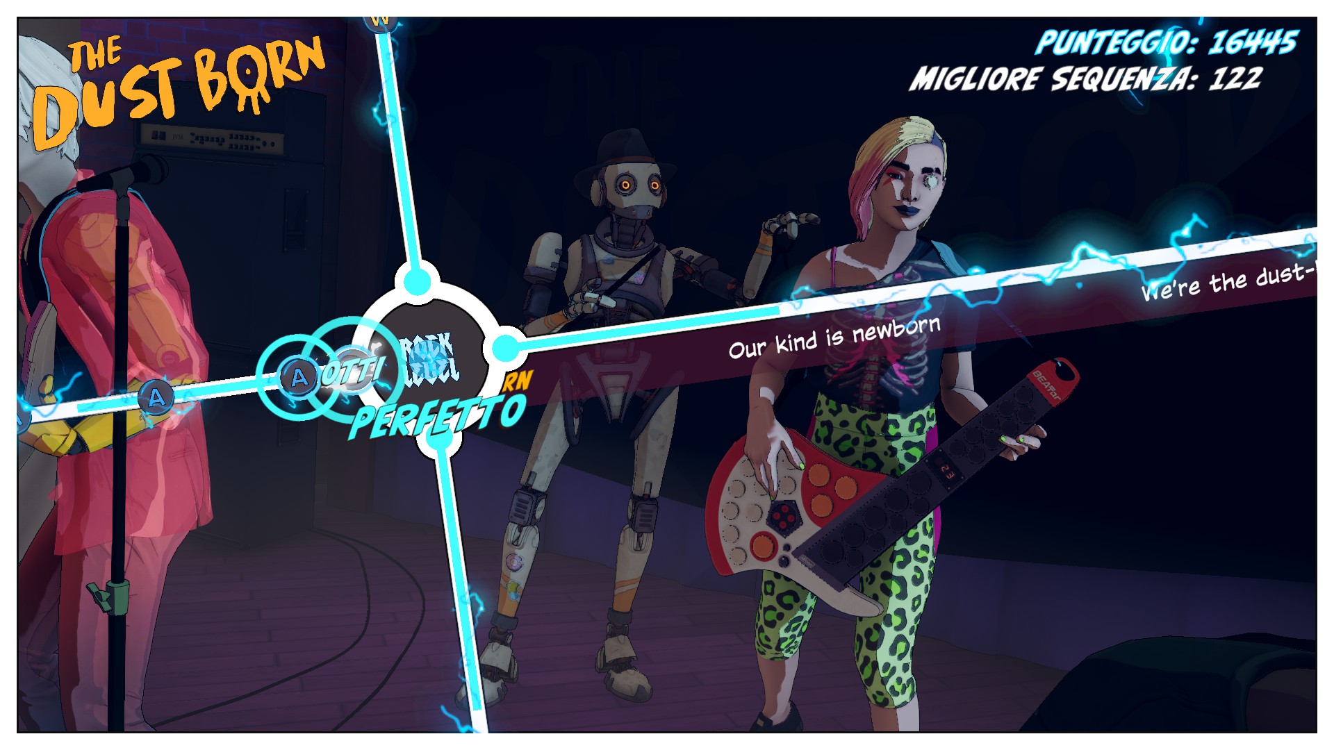 Questo il party principale, già abbastanza “woke”, al quale si aggiungeranno l’ansiosa sorella asiatica di Pax con occhio prostetico, un robot in cerca della propria identità e altri personaggi tutti estremamente inclusivi e variegati. Il gioco non ricade in particolari stereotipi, ma è evidente l’intento di includere veramente qualunque archetipo possibile in questo strambo team che tutto sembra tranne che un gruppo di fuggitivi che vorrebbe passare inosservato. La loro copertura da bizzarra band indie rock però regge bene e le canzoni, giocabili in sezioni rhythm game ben fatte, sono molto orecchiabili e memorabili.
