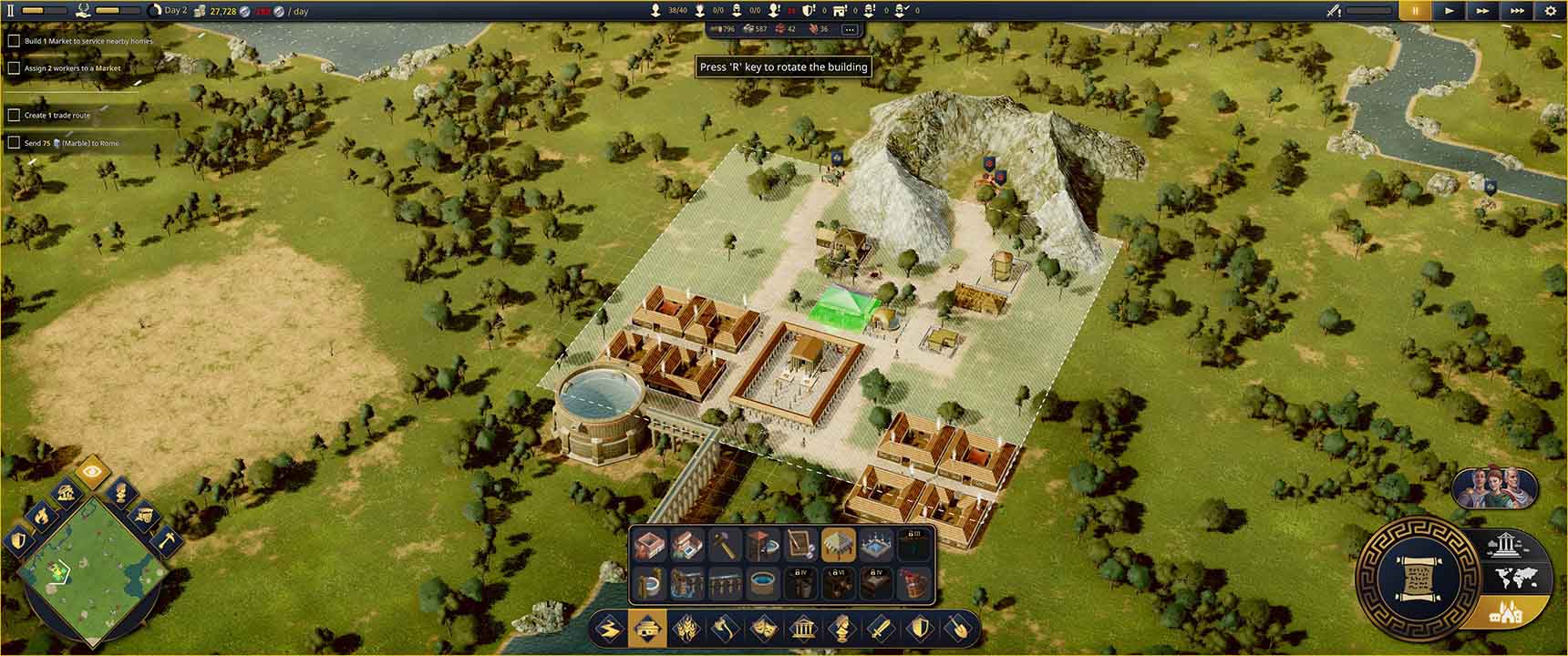 Il focus della costruzione cittadina di Citadelum non è tanto nell’edificazione vera e propria degli edifici con le loro attese, ma nel posizionamento strategico di ognuno di essi, una sorta di puzzle la cui soluzione consente di creare una rete efficiente di estrazione delle risorse, di conservazione, di raffinazione per nuovi prodotti e di vendita al dettaglio di essi. Ogni edificio, infatti, ha una sua area d’influenza: le dimore di patrizi e plebei vanno posizionate in modo che abbiano accesso al mercato, il mercato a sua volta è meglio che sia comunicante con i magazzini e i granai, e questi ultimi hanno bisogno che nella loro sfera di influenza ci siano orti, cave e altri edifici in grado di estrarre materie prime.