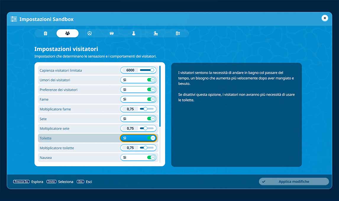 La modalità franchise è una nuova aggiunta che consente di giocare in coop con altri giocatori, magari affidandosi dei compiti diversi che sulla carta sembra un’idea simpatica, ma sarà sicuramente un incubo con giocatori sconosciuti; ancora non ho avuto modo di provarla, ma confido che prima o poi un amico si presti a questa opportunità. La modalità sandbox infine è dove Planet Coaster 2 esprime il suo pieno potenziale, con una personalizzazione che si può apportare fin dalle opzioni iniziali di creazione della mappa per customizzare a piacimento l’esperienza che si vuole dalla partita: niente gestione della corrente? Fatto. Soldi illimitati? Fatto. Le persone non hanno bisogno di andare in bagno? Beate loro ma… Fatto.