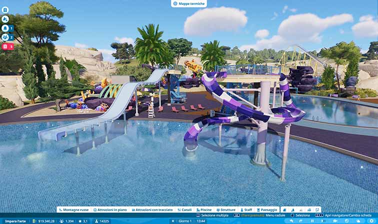 In questa ottica un’altra aggiunta interessante è quella della gestione della corrente e dell’acqua, un po’ sullo stile di Cities Skylines 2, dove bisogna creare una sorta i rete di tubi sotterranei per poter portare energia elettrica alle attrazioni dislocate per il parco giochi, e acqua corrente con un bel filtro d’acqua alle attrazioni acquatiche. Di per sé, quest’aggiunta sembra una seccatura in più a cui badare, ma in realtà non è così tanto complessa e, anzi, aggiunge un pizzico di sfida in più alla pianificazione logistica del parco.