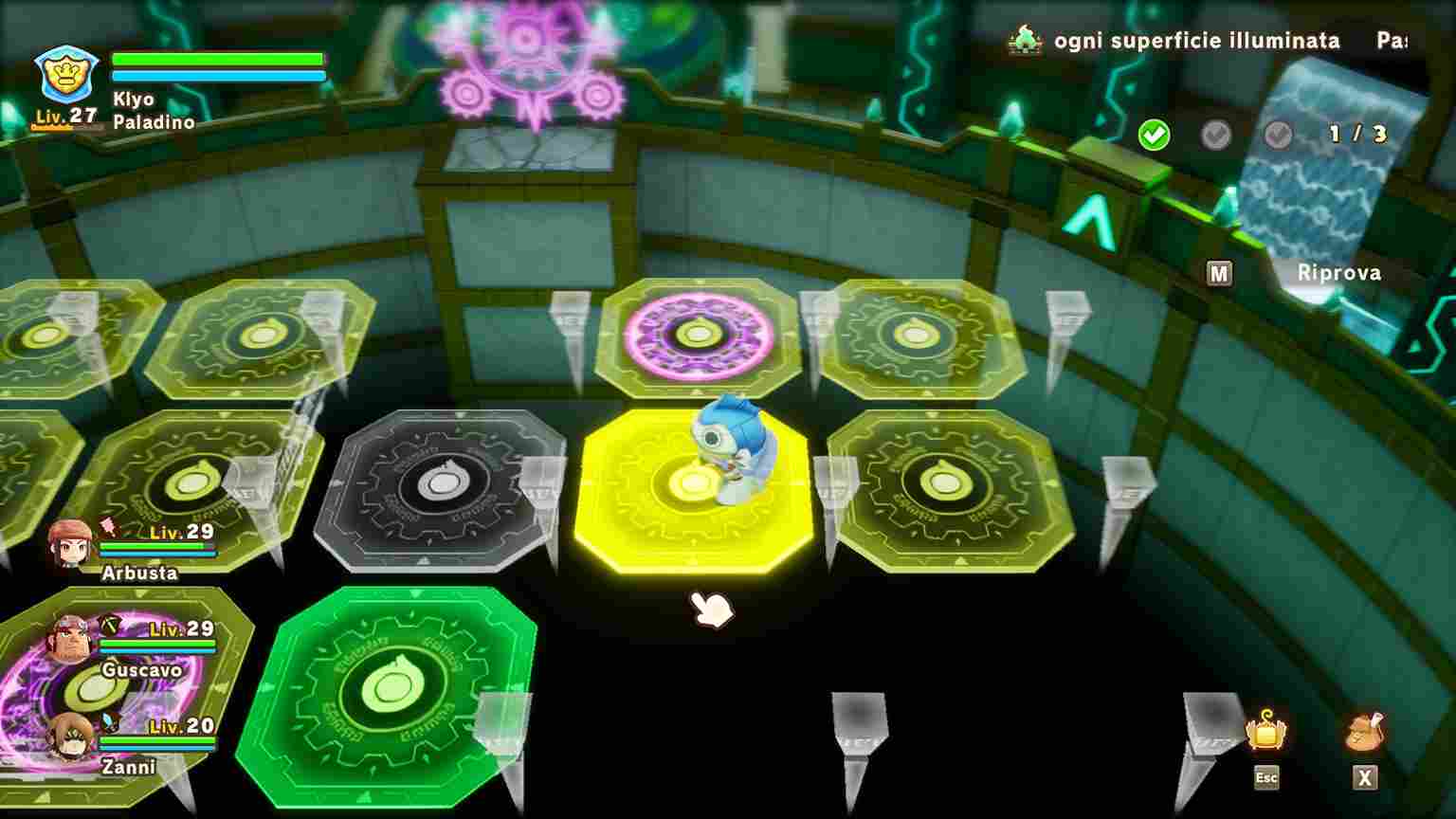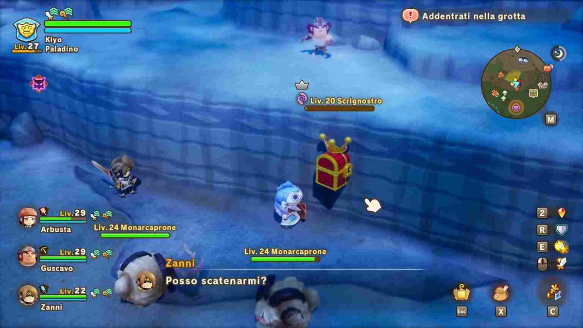 Anche il combattimento è simile a quello dei titoli chibi con protagonista l’impavido Link, soprattutto se come me sceglierete di essere dei Paladini con spada e scudo. C’è da dire che non è però altrettanto curato a livello tecnico, infatti ci è sembrato che i comandi non fossero particolarmente responsivi, soprattutto con schivate e attacchi caricati, ed è capitato di incappare in piccoli bug come nemici che si incastravano su alberi e pareti o barre dei PS bloccate.