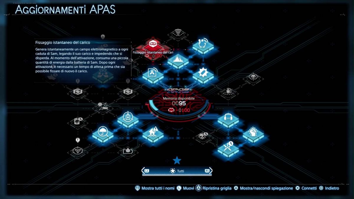 Si tratta di miglioramenti gestibili attraverso la spesa di “punti di memoria” che ad esempio migliorano la strumentazione di Sam come lo scanner topografico o il portapacchi o ancora il numero di like che possiamo dare in un determinato intervallo di tempo o le previsioni meteorologiche e le allerte inondazioni; un’aggiunta interessante che dà un maggiore senso di progressione lato gameplay.