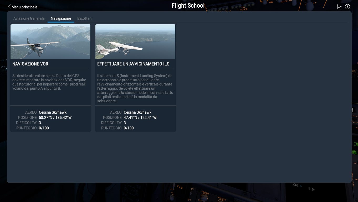Passando alla sezione “Navigazione” potremo sperimentare il volo strumentale attraverso punti VOR, e come effettuare un avvicinamento ed atterraggio “ILS“, ovvero basandosi esclusivamente sulla strumentazione, con l’ausilio dell’autopilota ed il minimo di interazione umana diretta.