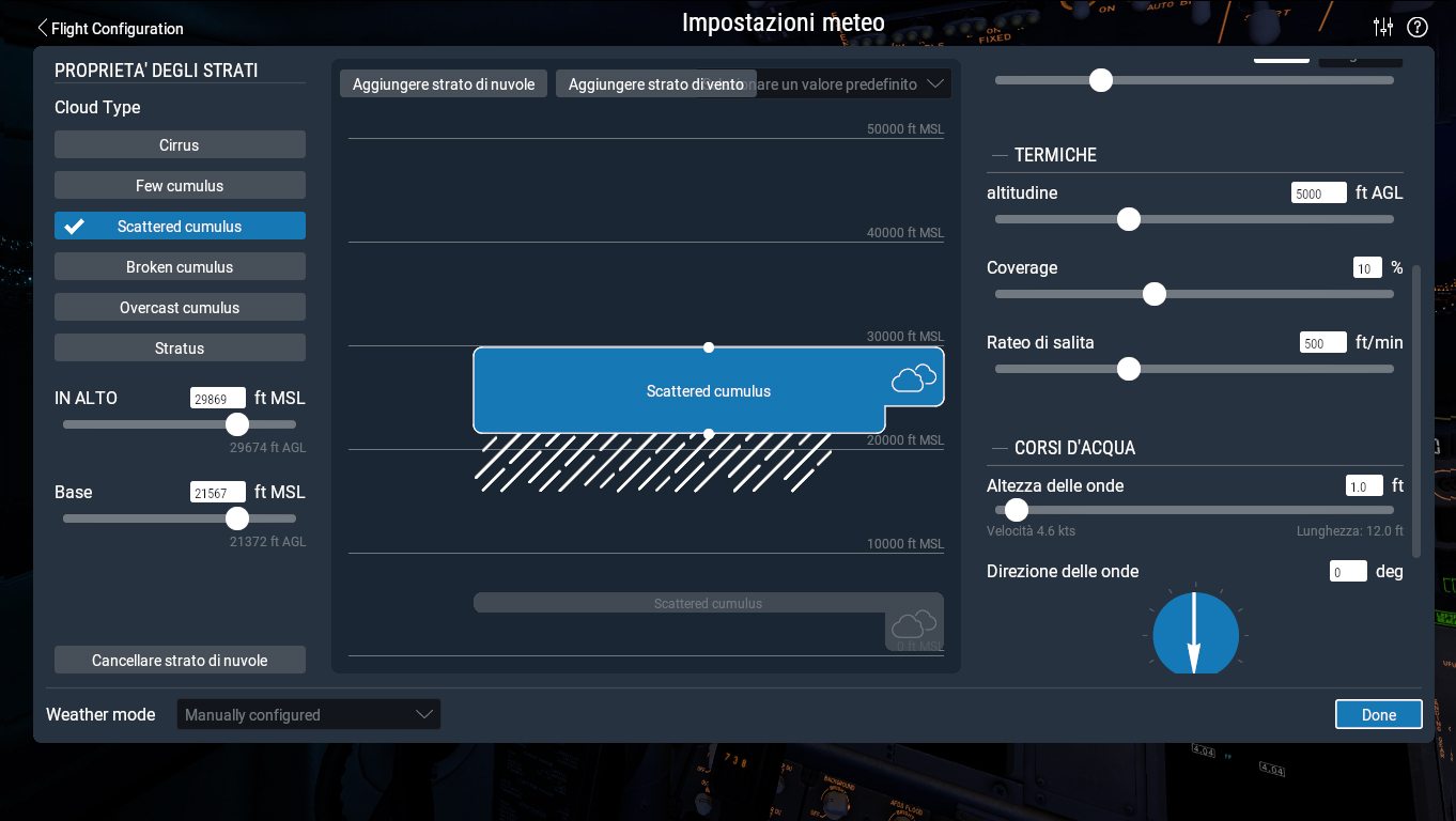 Questa funzione è una delle più completee potenti di questo simulatore, e ci consente di cambiare ogni piccolo dettaglio, dal vento alla pressione, l’altezza delle termiche e il tipo di precipitazioni.