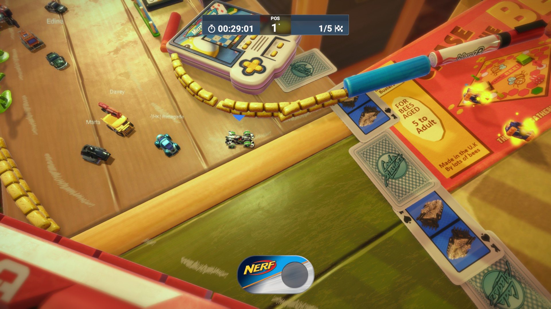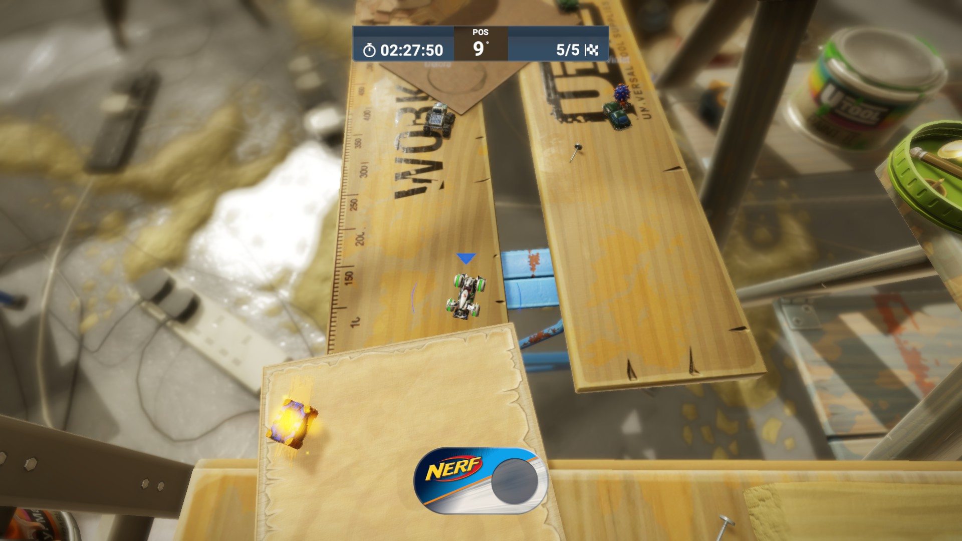Per questo titolo la Hasbro ha voluto includere altri suoi prodotti come G.I. Joe, Mangia Ippo e Nerf. Quest’ultimi costituiscono dei veri e propri power up che potremo raccogliere durante le gare. Martelli, bombe e fucili saranno a nostra disposizione per intralciare e buttare fuori pista i nostri avversari.