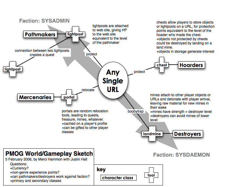 Una delle classi, i Pathmakers, potevano piazzare lampioni negli indirizzi url. Facendolo potevano creare missioni consistenti nel visitare siti web, portando i giocatori che ci capitavano a fare un “tour guidato” dei siti scelti dal Pathmaker. Ricordo che la varietà di missioni era notevole, e faceva piacere trovare, ad esempio, una “quest” che ti portasse per mano a studiare la storia dell’inghilterra, piuttosto che i quadri di picasso.