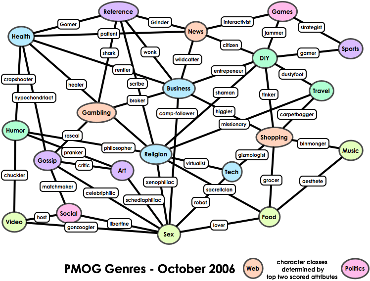 Una delle caratteristiche sicuramente più interessanti di PMOG, e un argomento tuttora attuale, era il profiling degli utenti. In base ai siti da loro più visitati, i giocatori venivano assegnati in automatico a una delle quattro classi disponibili.