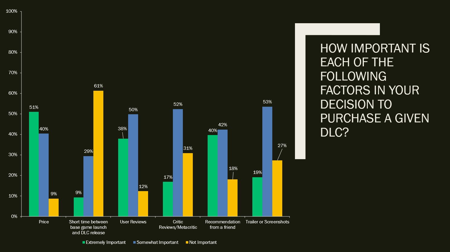 Uno dei fattori più importanti, secondo l’utenza, è il costo. Ciò può portare a differenti ipotesi: i giocatori stanno attenti ai costi; i giocatori ritengono che i DLC abbiano un prezzo eccessivo; i giocatori non ritengono che il prezzo non rappresenti il valore reale del prodotto.