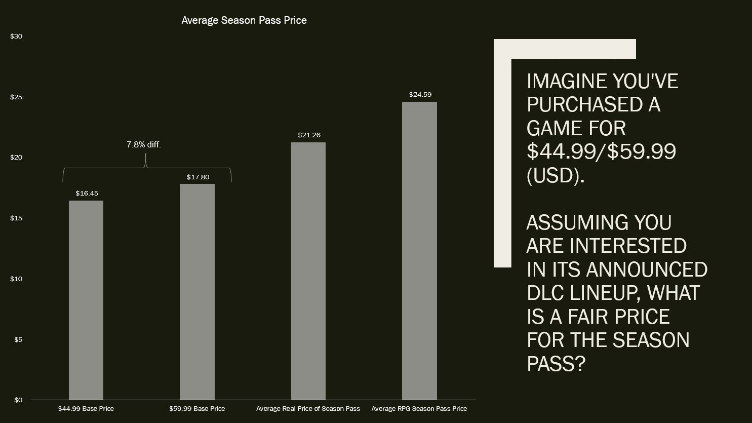 La fluttuazione del prezzo del DLC è di circa il 7,8%, con 16.45$ nel primo caso e 17.80$ nel secondo. Nonostante il risultato sia evidente (ovvero l’utenza è disposta a pagare per dei contenuti aggiuntivi in proporzione con il valore del titolo), è importante considerare che Obsidian Entertainment ritiene i dati non significativi, vista la natura e la struttura delle domande.