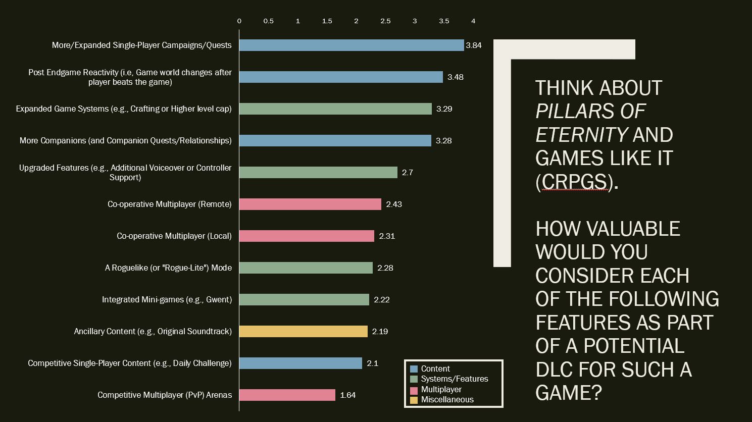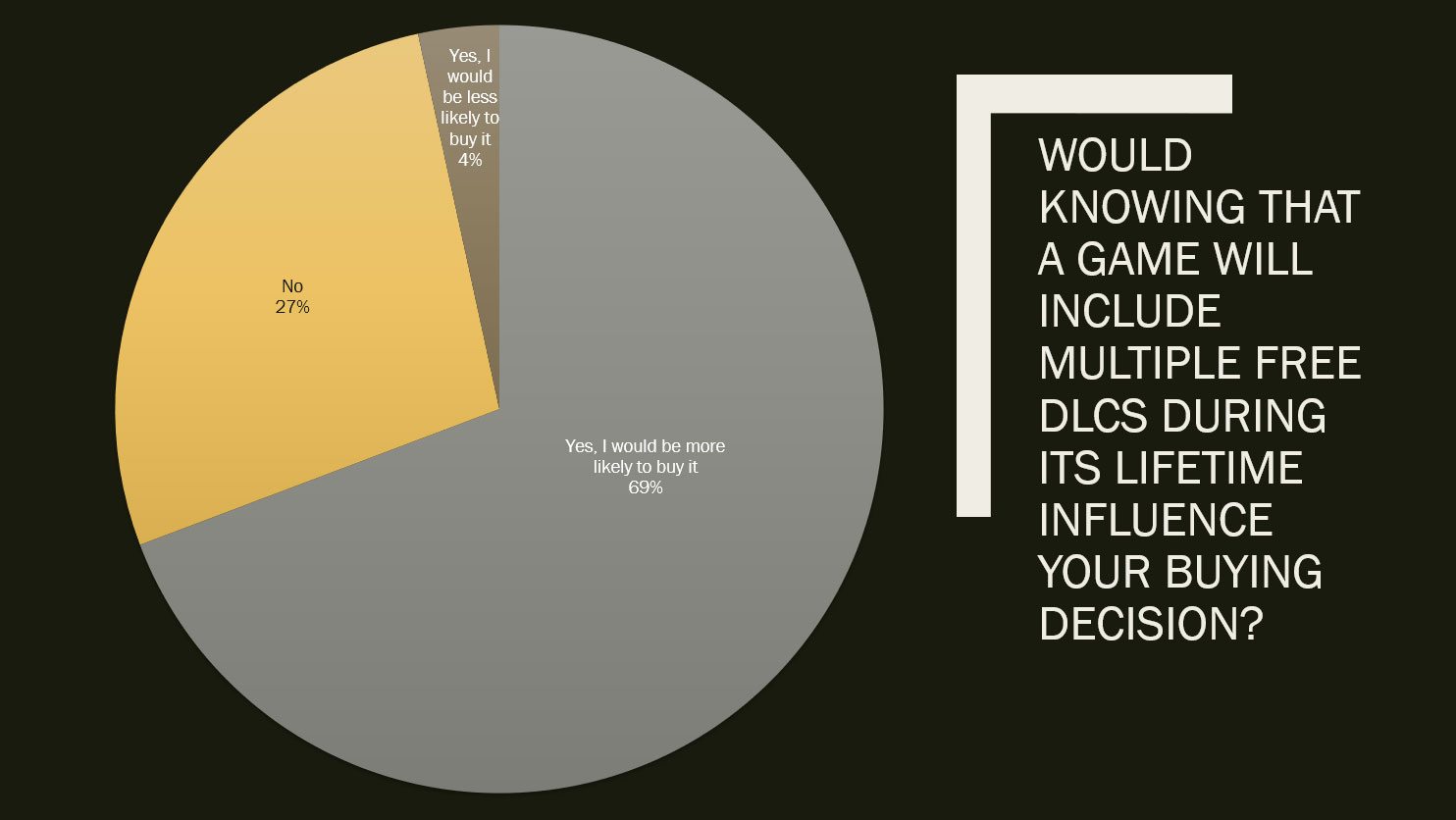 Prendendo in esame i dati raccolti, si evince come gli utenti amino i DLC corposi, con contenuti profondi e longevi, spesso associati alla trama. Prediligono ovviamente quelli Gratuiti, ma sono in grado di valutare se il prezzo di un DLC vale ciò che questo è in grado di offrire in termini di gioco.