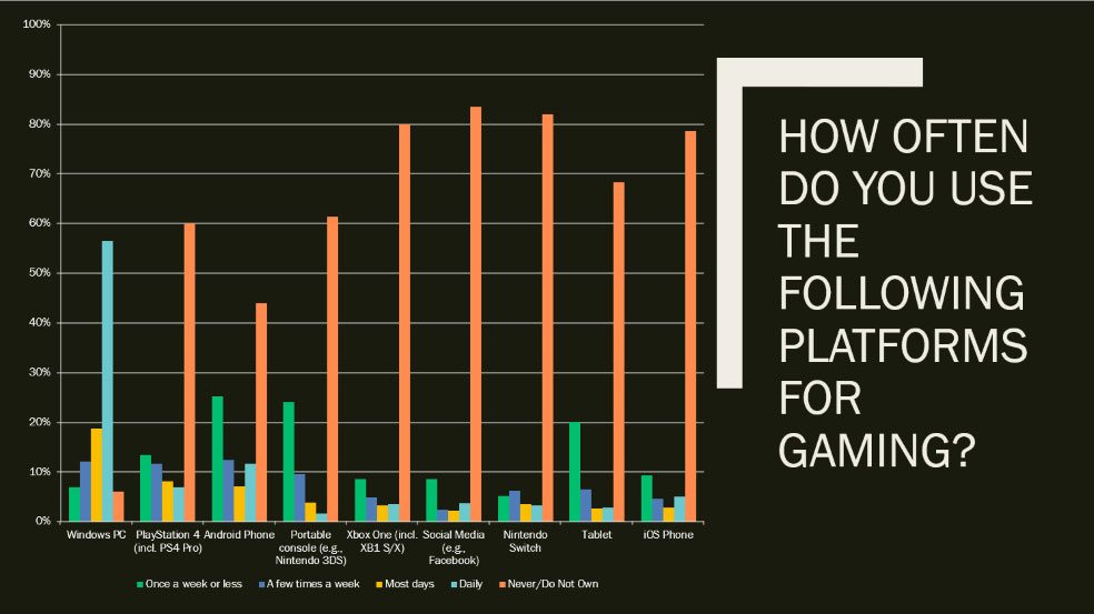 I computer con sistema operativo Windows sono i dispositivi più utilizzati per giocare, seguiti con enorme distacco dagli smartphone Android, Playstation 4 e le varie console portatili. Nessun altro dispositivo viene utilizzato con altrettanta frequenza.
