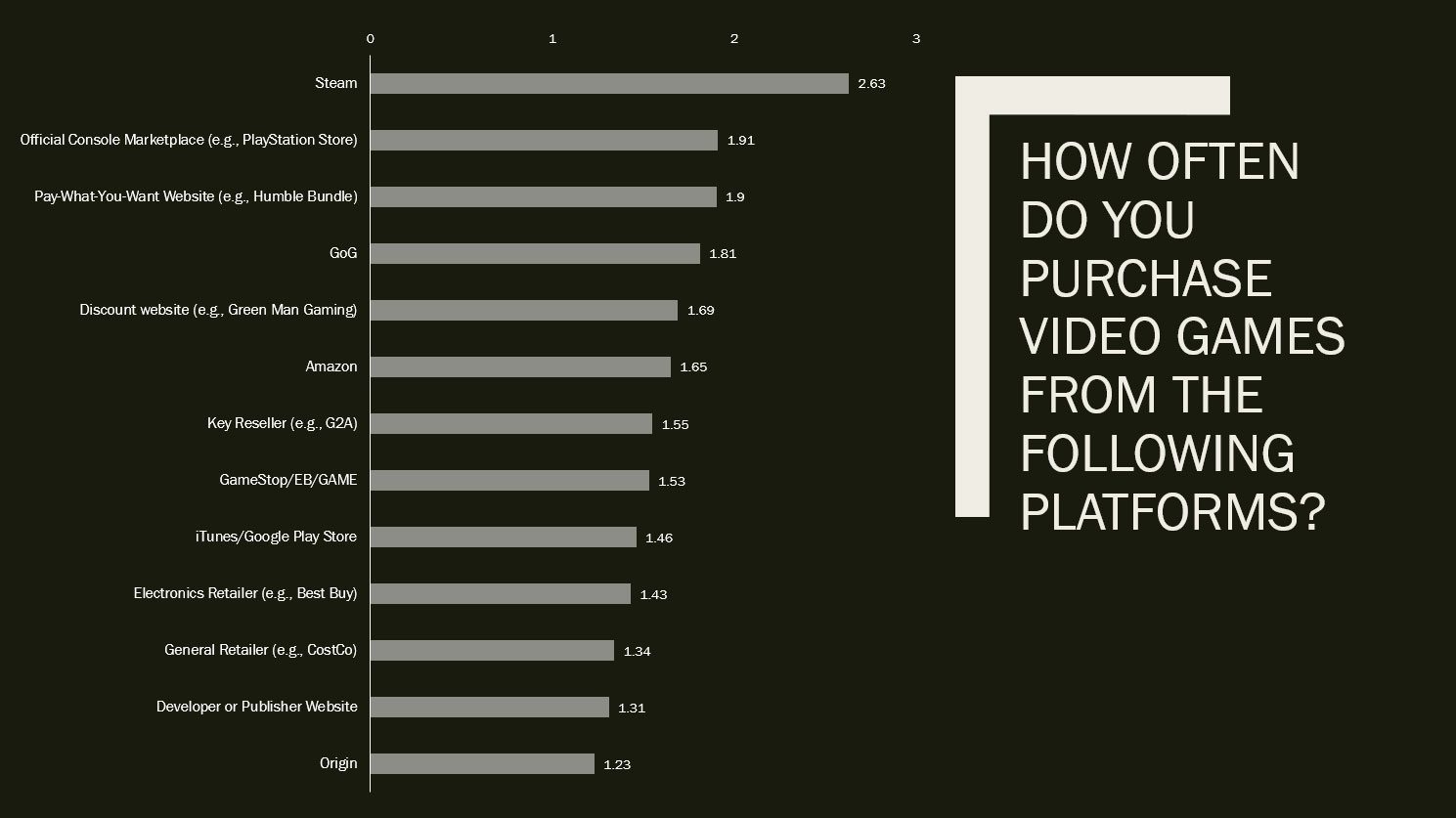 Desta però particolare interesse la seconda posizione, ovvero i Marketplace Ufficiali delle Console. Questo risultato implica uno spostamento del videogiocatore medio verso il digitale, abbandonando così la classica copia fisica.