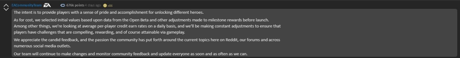 In buona fede o meno un impiegato della EA ha deciso di rispondere al commento: “Il nostro obiettivo è di fornire ai giocatori un senso di orgoglio e di soddisfazione personale per sbloccare diversi eroi.